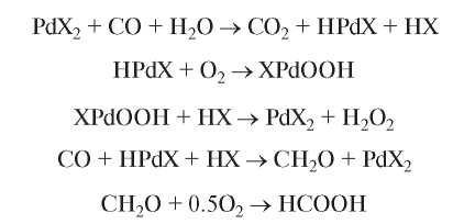 PdBr2–CuBr2–C2H5OH–H2O | [PdBr2]= 0.045 M, [CuBr2] = 0.015 M, [ВА] = 0.9 М, Т = 40°С, CO : O2 = 1 : 1 | 1.2 | этиловый эфир муравьиной кислоты, этилацетат, 1,1-диэтоксиэтан |
