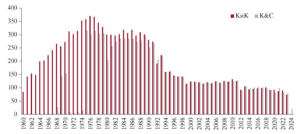 Таблица 1. Количество публикаций КиК/K&C 1960–2024, зарегистрированных в БД*