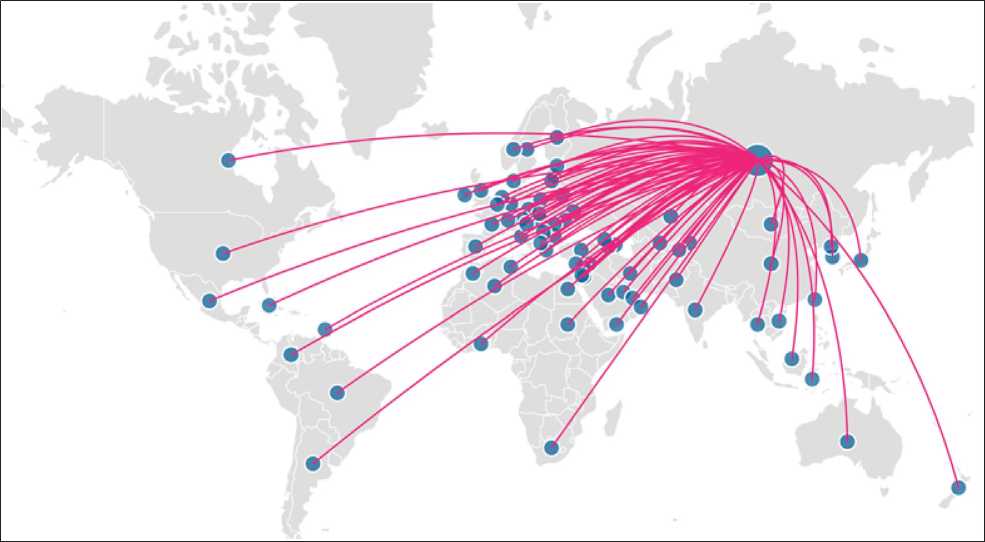 Рис. 2. Геолокация авторов публикаций в КиК. С республиками бывшего СССР аффилировано 11.7 тыс. статей: РФ – 9927, Украина – 935, Казахстан – 296, Азербайджан – 242, Беларусь – 175, Армения – 152. Другие страны (более 50 статей): КНР – 141, Германия – 97, Болгария – 84, Польша – 73, Франция – 68, Индия – 67, США – 66.