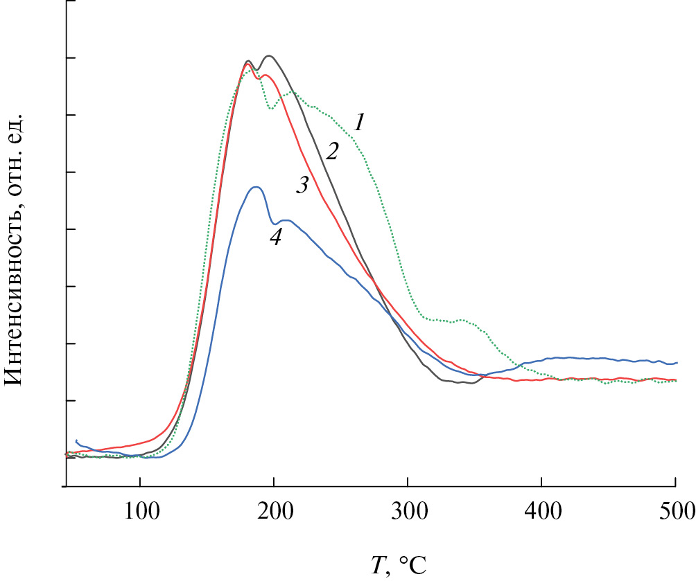 Рис. 1. Профили ТПД NH3 образцов 0.2% Cu/0.3% Pd/Al2O3 (1), 0.2% Cu/0.3% Pd/5% CaO/Al2O3 (2), 0.2% Cu/0.3% Pd/5% SrO/ /Al2O3 (3) и 0.2% Cu/0.3% Pd/5% BaO/Al2O3 (4).