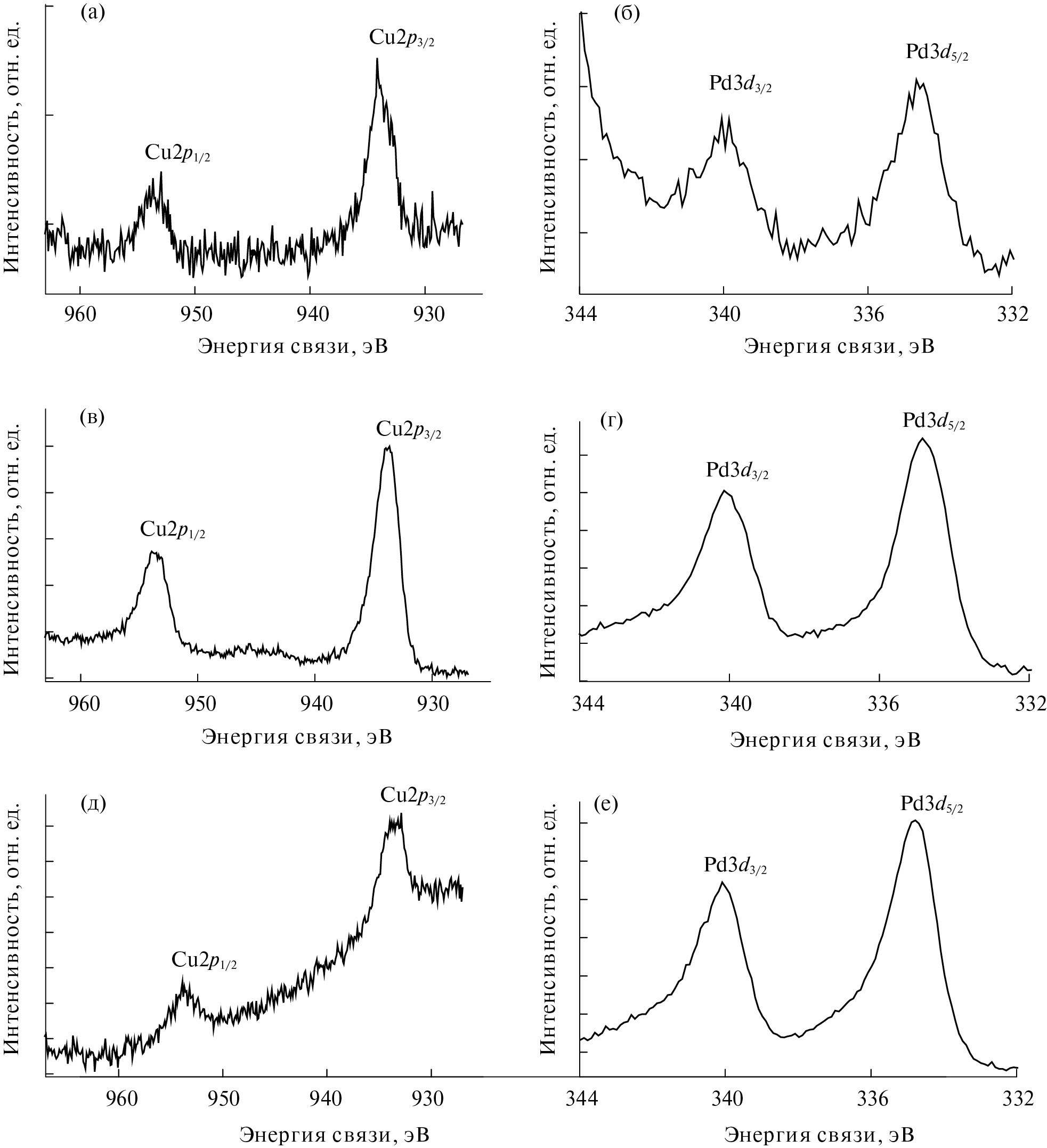 Рис. 4. РФЭ-спектры Cu2p и Pd3d образцов 0.2% Cu/0.3% Pd/5% CaO/Al2O3 (а, б), 0.2% Cu/0.3% Pd/5% SrO/Al2O3 (в, г) и 0.2% Cu/0.3% Pd/5% BaO/Al2O3 (д, е).
