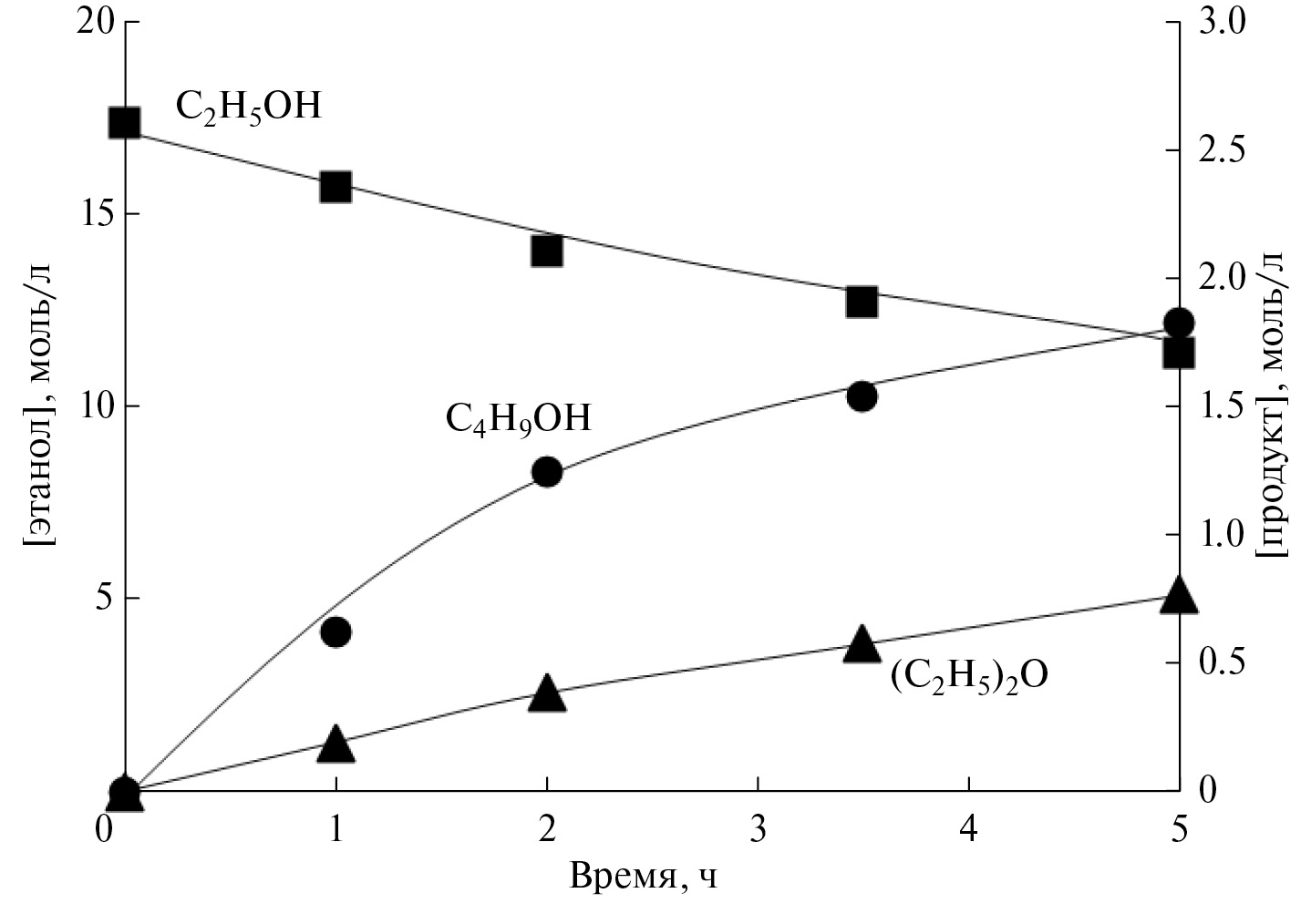 Рис. 6. Кинетические кривые расхода этанола и накопления продуктов в присутствии катализатора 0.2% Cu/0.3% Pd/Al2O3 [13].