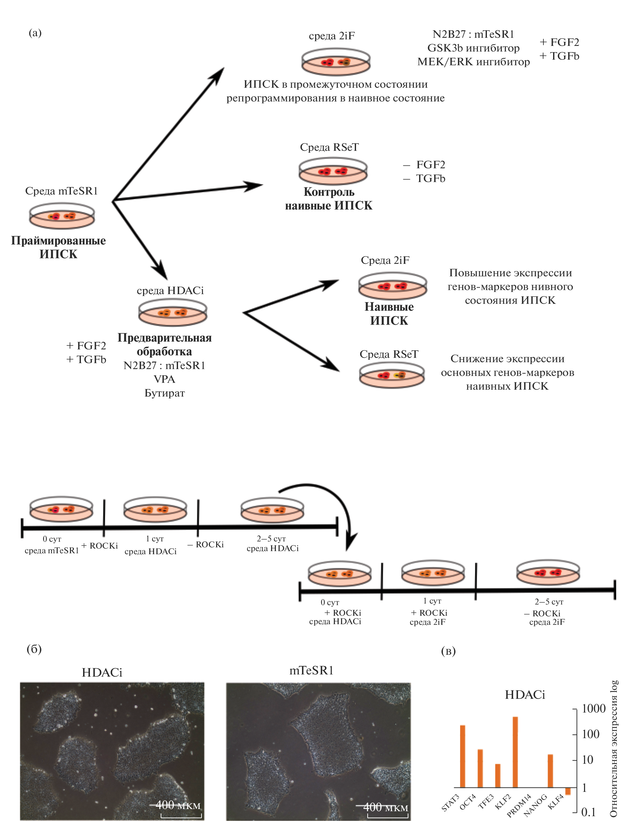 Human pluripotent stem cells (PSCs) can be maintained in a naive or primed state of pluripotency in vitro. Being in one state or another, PSCs have different potentials of differentiation into extra-embryonic and germinal derived cells of the embryo. In terms of the expression profile and epigenetic pattern of the genome, naive PSCs are comparable to the cells of the inner cell mass of the blastocyst, while primed PSCs are similar in their characteristics to the cells of the postimplantation epiblast. Reprogramming of primed PSCs into the naive state and maintenance of naïve PSCs in culture is a crucial issue in studying the epigenetic processes of preimplantation development of the human embryo and methods for efficient differentiation of PSCs into derivatives of embryonic and extra-embryonic cells. The aim of this work is to reprogram primed induced pluripotent stem cells (iPSCs) into a naïve pluripotent state to obtain a homogeneous population of iPSCs according to the state of pluripotency in culture. The task of this work is to develop a protocol and conditions for reprogramming primed iPSCs into a naive state of pluripotency. In this work, naive iPSCs were obtained under conditions of application of growth factors FGF2, TGFβ1 and inhibition of GSK3β and the MEK/ERK signaling pathway (2iF medium). Pretreatment of primed iPSCs with histone deacetylase inhibitors (HDACi) changes the cell morphology and gene expression profile of PSCs towards an earlier state of pluripotency. Using pretreatment of HDACi primed iPSCs followed by maintaining in 2iF medium, we obtained naive iPSCs comparable in colony morphology and expression profile of naive state marker genes with control naive iPSCs obtained in RSeT medium. In order to confirm the naive state of pluripotency of iPSCs obtained 2iF conditions, it is necessary to carry out single cell RNA sequencing.