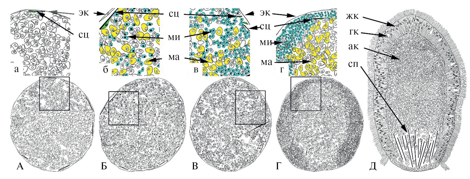 Рис. 3. А-Д: Эмбриональное развитие и личинка – паренхимула Adocia cinerea (Demospongiae, Haplosclerida) (по материалам статьи Meewi, 1941). а-г: дифференцировка и сортировка клеток зародыша на примере отдельных типов клеток. Полное, неравномерное и неупорядоченное дробление приводит к формированию морулы. На стадии ~ 2000-4000 клеток начинается дифференцировка клеток зародыша (А). На поверхности морулы, состоящей из морфологически однородных клеток, появляются склеробласты, образующие личиночные спикулы. Б - асимметричное деление клеток морулы приводит к появлению двух типов клеток – мелкие и крупные амёбоидные клетки (микромеры (ми) и макромеры (ма), согласно номенклатуре Генриетты Меви). В – начало сортировки клеток: мелкие клетки (ми) мигрируют на периферию, а крупные (ма) к центру зародыша. Склеробласты со спикулами также перемещаются внутрь зародыша. Г – стадия предличинки. Мелкие клетки сплотились на поверхности и постепенно формируют жгутиковый эпителий, появляется морфологически выраженная переднезадняя полярность. Е – личинка-паренхимула. Условные обозначения: ак – внутренние амёбоидные клетки личинки, гк – глобулярные клетки, жк – наружные жгутиковые клетки, ма – макромеры, жёлтый цвет, ми – микромеры, голубой цвет, сц – склероциты, зелёный цвет, сп – спикулы, эк – эмбриональная капсула.