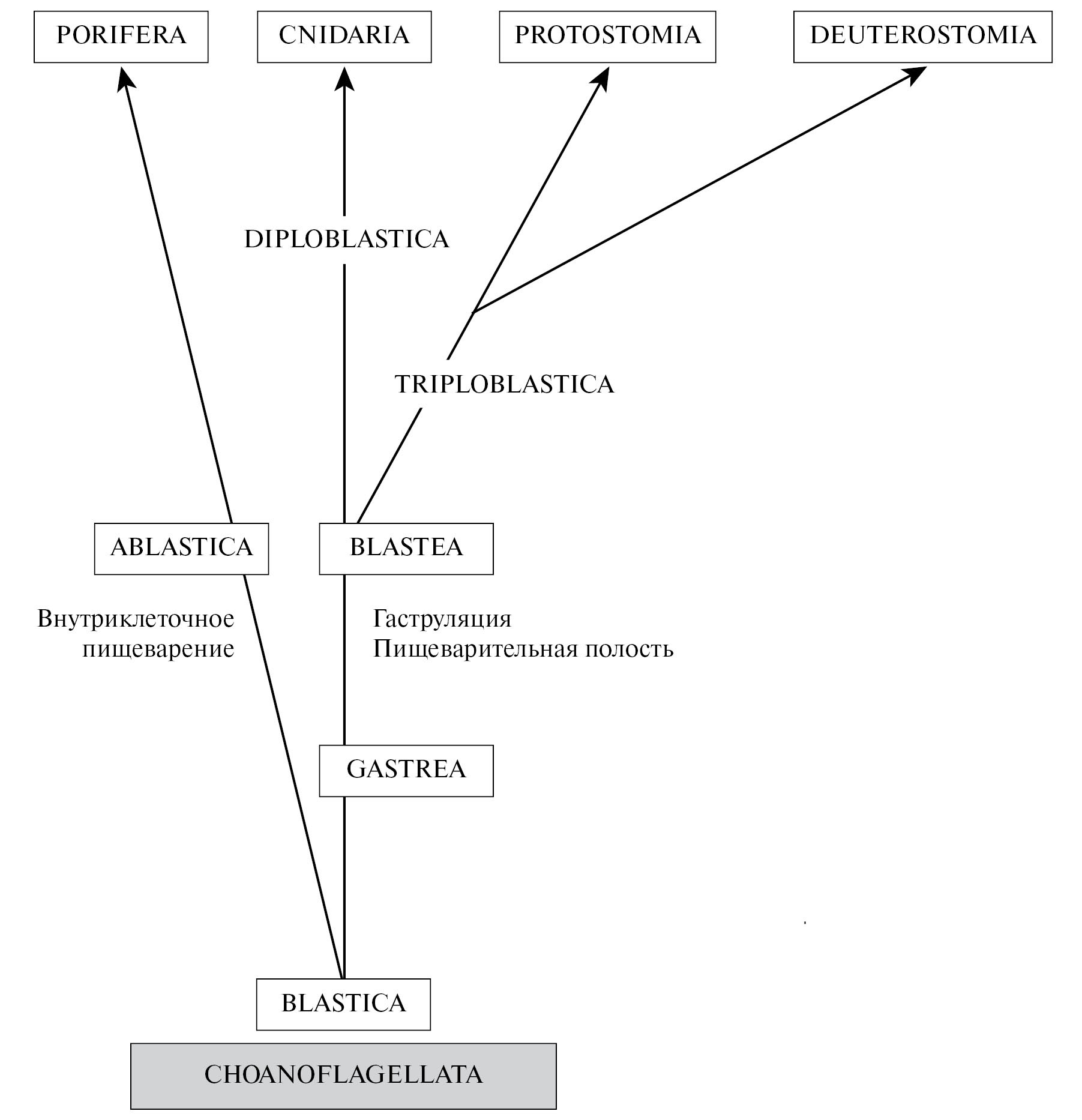 Таким образом ранние этапы формирования Metazoa схематически можно представить как появление двух ветвей (рис. 4). В одной из них – у Ablastica – пищеварение сохраняло внутриклеточный характер. Возникновение полостного пищеварения в линии Blastica было обусловлено появлением особой пищеварительной системы, возникшей в результате дифференциации в числе зародышевых листков энтодермы. Наблюдаемые в раннем онтогенезе губок элементы морфогенетических процессов, в том числе эпителиальные морфогенезы, наблюдающиеся при формировании разветвленной ирригационной системы, характерны для всех Metazoa. Именно общность механизмов морфогенетических процессов определяет внешнее сходство личинок Губок и Стрекающих. При этом, однако, у губок не образуются зародышевые листки: у губок нет ни эктодермы, ни энтодермы и, следовательно, у них отсутствует характерный для всех остальных Eumetazoa, включая Diploblastica и Triploblastica, процесс гаструляции.