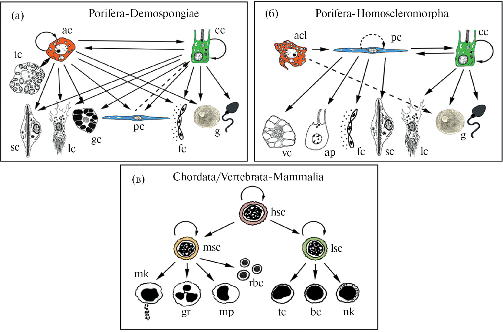 Рис. 1. Пластичность соматических стволовых клеток животных (соматические стволовые клетки = стволовые клетки взрослых (adult stem cells) = ASC). ASC выделены цветом, продукты дифференциации показаны черно-белыми схемами. (а, б) Представители губок: (а) Amphimedon queenslandica, Ephydatia fluviatilis; (б) Oscarella lobularis (ac — археоцит, cc — хоаноцит, tc — тезоцит, sc — склероцит, lc — лофоциты, gc — гранулярные клетки, pc — пинакоциты, fc — фолликулярные клетки, g — гаметы, vc — вакуолярные клетки, ap — апопилярные клетки). (с) Млекопитающие (для сравнения) (hsc — гематопоэтические стволовые клетки, msc — миелоидные предшественники, lsc — лимфоидные предшественники, mk — мегакариоцит, gr — гранулоциты, mp — макрофаги, rbc — красные кровяные клетки, tc — Т-клетки, bc — B-клетки, nk — лимфоциты-киллеры). Для губок характерно превращение одного типа ASC в другой, а также дифференцировка гамет из потомков ASC. (Из Rinkevich et al., 2022, с изменениями; © 2021 The Authors, опубликовано John Wiley & Sons Ltd. под лицензией CC-BY-4.0.)