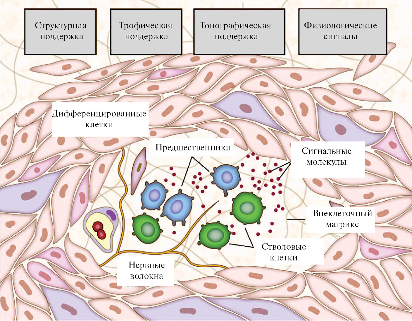 Традиционно считается, что многие ССК населяют межклеточные компартменты в дифференцированных тканях, называемые нишами стволовых клеток (НСК) (Cheung, Rando, 2013). НСК обеспечивают специфическое микроокружение, регулирующее выживание и пролиферацию популяции ССК.