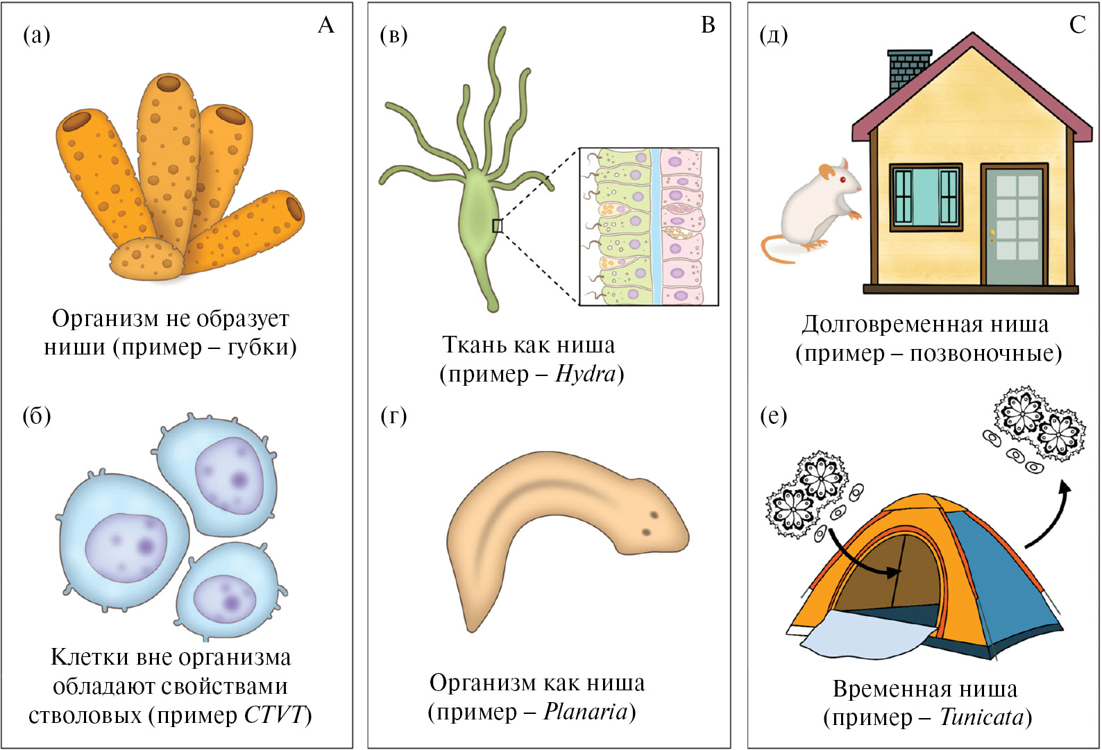 Архитектура типа “А” (отсутствие очевидной ниши) (рис. 4а, б). Такой вариант характерен для животных, у которых нет структурированных НСК. Для них типичен высокопластичный набор ССК, т. е. ССК появляются по мере необходимости (например, мезенхимальные археоциты демоспонгий). Кроме того, каждая стволовая клетка создает свою собственную микросреду, заменяющую оформленную нишу.