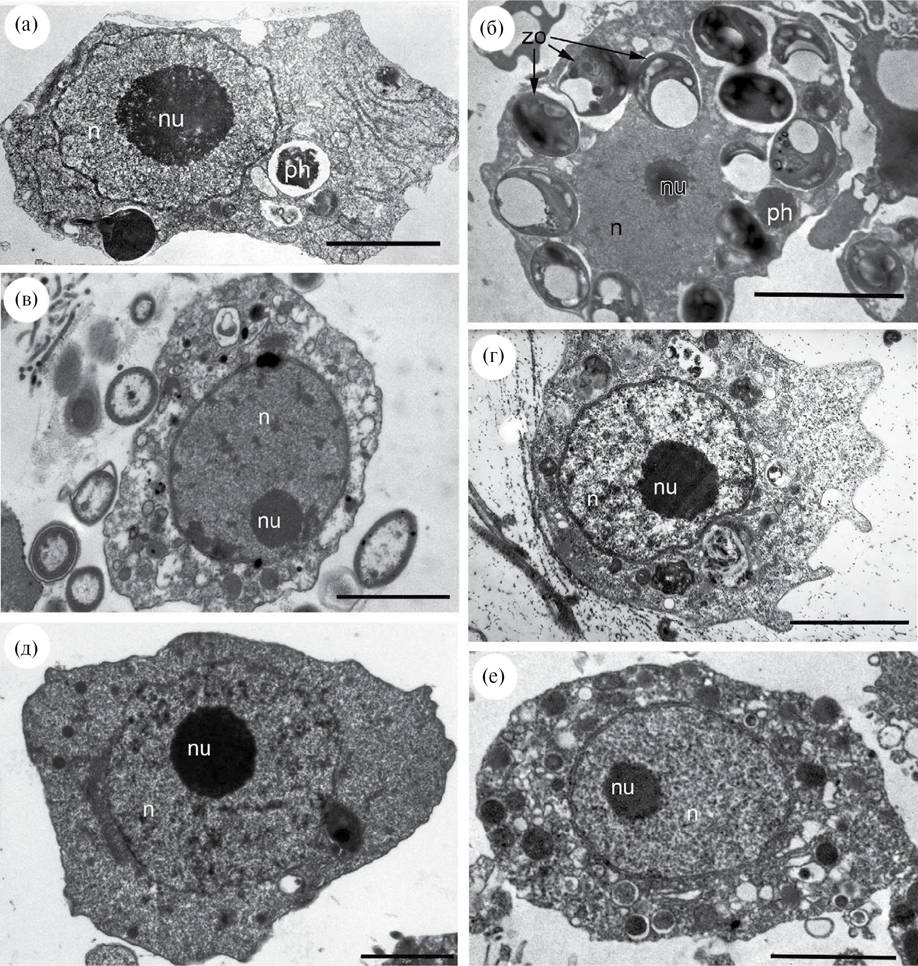 Рис. 5. Археоциты разных демоспонгий (данные трансмиссионной электронной микроскопии. (а) Ephydatia muelleri (отряд Spongillida); (б) Lubomirskia baicalensis (отряд Spongillida); (в) Spongia officinalis (отряд Dyctyoceratida); (г) Halisarca dujardinii (отряд Chondrillida); (д) Crellomima imparides (отряд Poecilosclerida); (е) Suberites domuncula (отряд Suberitida). n — ядро; nu — ядрышко; ph — фагосома; zo — эндосимбиотическая зоохлорелла. Масштабные линейки: а, в—е = 2 мкм; б = 5 мкм (из Ereskovsky et al., 2024; разрешение на воспроизведение рисунка получено от John Wiley and Sons, License Number 5916501382860).