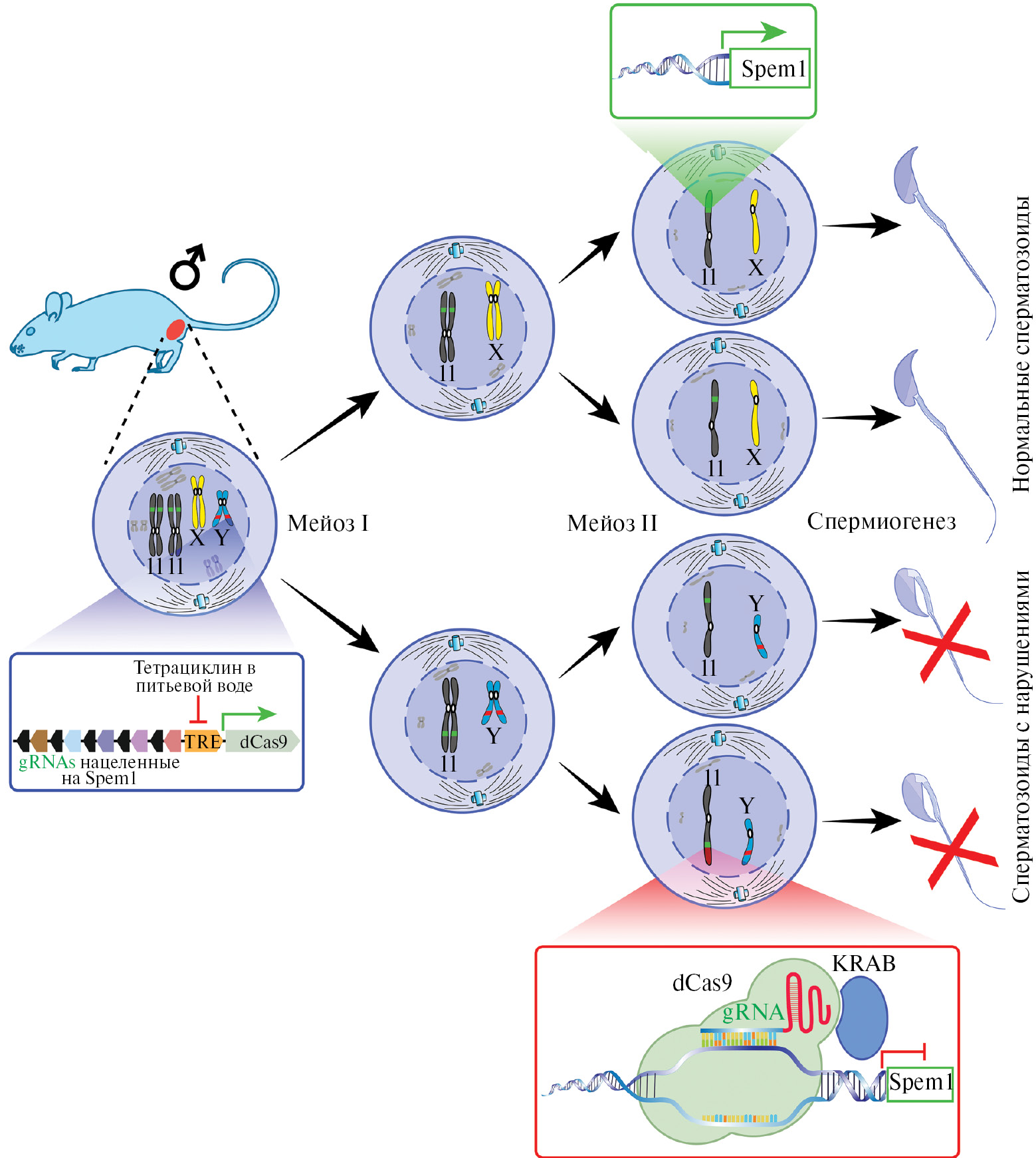 Рис. 3. Схема селекции спермы по половому признаку для получения пометов мышей, состоящих только из одних самок по (Yosef et al., 2024). Все клетки организма трансгенных самцов, в том числе и ранние половые клетки, содержат Y-хромосому и в отсутствие в питьевой воде тетрациклина экспрессируют генетическую конструкцию, подавляющую экспрессию гена Spem1 (синий прямоугольник). Экспрессия Spem1 происходит только в гаплоидных половых клетках, образующихся в результате делений мейоза — особого типа деления, характерного только для развивающихся мужских и женских половых клеток, приводящего к редукции числа хромосом вдвое и образованию гаплоидных гамет. В части гаплоидных гамет, содержащих X-хромосому (сверху) ген Spem1 активен (зеленый прямоугольник), а в тех, что содержат Y-хромосому (снизу), заблокирован (красный прямоугольник). В результате X-содержащие гаметы развиваются нормально, тогда как Y-содержащие гаметы либо погибают, либо становятся аномальными.