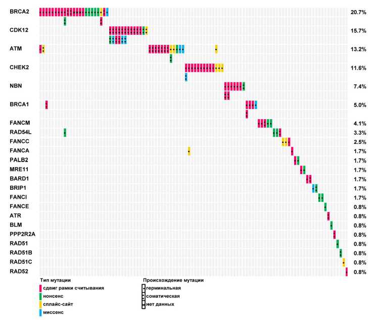 Results. Hereditary or somatic pathogenic/likely pathogenic variants in any of the 34 HRR genes were detected in 102/541 (18.9 %) PC cases. A total of 121 mutations were detected in 102 patients, of which the majority (72/121, 59.5 %) were germline variants. Most frequently, mutations were detected in BRCA2 (25/121, 20.7 %), CDK12 (15.7 %), ATM (13.2 %), CHEK2 (11.6 %), NBN (7.4 %), BRCA1 (5.0 %), FANCM (4.1 %), RAD54L (3.3 %). The pattern of BRCA2, CHEK2, and NBN lesions was dominated by inherited defects (68.0, 92.9 and 66.7 %, respectively), whereas 56.3 % of ATM variants and all CDK12 mutations were of somatic origin. ATM and CDK12 mutations were represented by unique variants. In BRCA2, a nonsense substitution p.Gln2157Ter was detected twice.