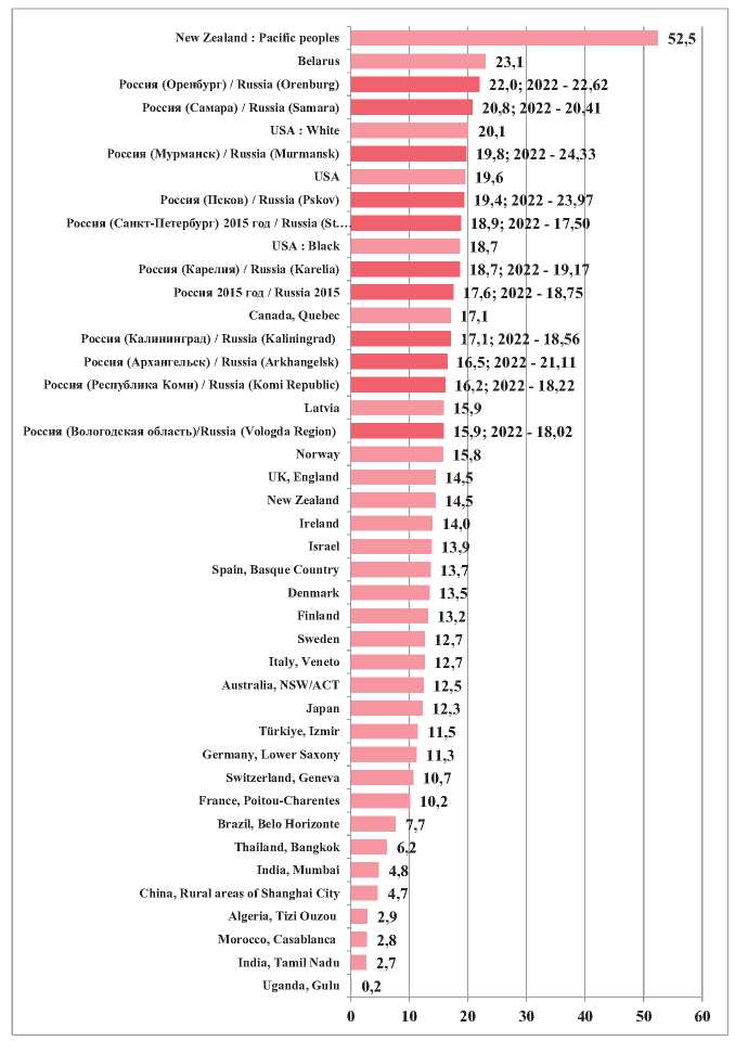 Если показатели заболеваемости различаются в 10 раз по регионам мира, как это было показано на рис. 1 и рис. 3, то показатели смертности демонстрируют меньшие региональные различия (рис. 3). Самые высокие показатели смертности в регионах мира в 2020 г. наблюдались в Восточной Европе, Микронезии/Полинезии, странах Карибского бассейна и Северной Америке. Показатели заболеваемости увеличились или стабилизировались с конца 1990-х гг. во многих странах по регионам, при этом самый быстрый рост наблюдался в Южной Африке и нескольких странах Азии.
