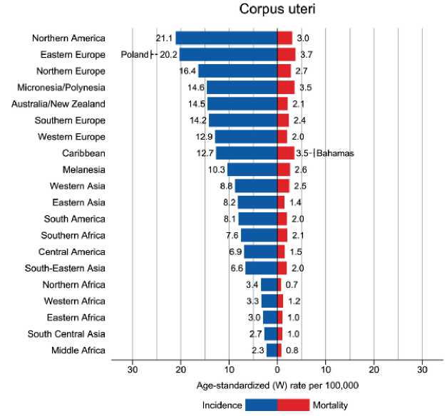 Fig. 3. Regional age-standardized incidence and mortality rates of uterine cancer in 2020. Rates are shown in descending order from the global age-standardized incidence rate (W), with the highest national age-standardized incidence and mortality rates overlaid. Source: GLOBOCAN 2020 [2]