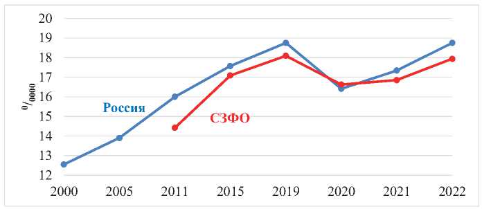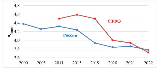 С 2011 по 2022 гг. смертность возросла в грубых показателях на 2,72 %, в стандартизованных снизилась на 12,5 % (табл. 2). Весь прирост смертности связан с увеличением в структуре населения России удельного веса женщин старших возрастных групп. Те же тенденции выявлены для женщин в СЗФО РФ. Уровни смертности женского населения в России и СЗФО РФ в 2022 г. практически совпадают (3,8 0/0000, 3,7 0/0000), (рис. 6, табл. 2).