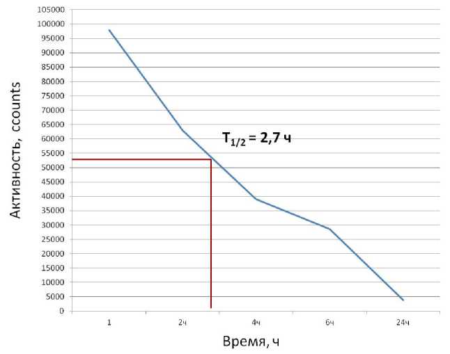 Выполненные исследования по изучению фармакокинетических характеристик [99mTc]Tc-HYNIC-PSMA показали, что после однократного внутривенного введения РФЛП достаточно быстро покидает кровеносное русло, его период полувыведения (Т½) из плазмы крови по данным непрямой радиометрии составил 2,7 ч. (рис. 1).