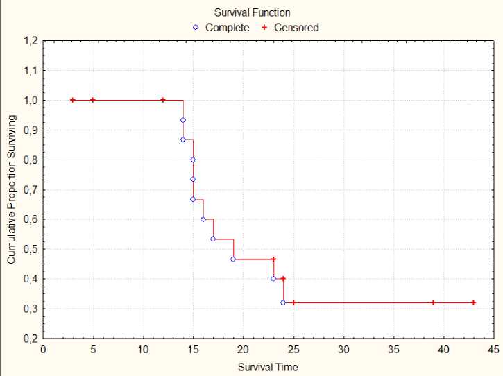 Умерли 10 (56 %) из 18 пациентов в сроки от 14 до 24 мес.: 6 — от прогрессирования (диссеминация опухолевого процесса / портальная гипертензия из–за местно-распространенного процесса); 3 — от холангита / сепсиса; 1 — от интеркурентной патологии. Средняя продолжительность жизни (СПЖ) составила 17,2 мес. 1-2-3 - летняя актуариальная выживаемость = 89−28−11 % соответственно. Медиана ОВ по методу Каплан – Майер = 18 мес. (рис. 3)