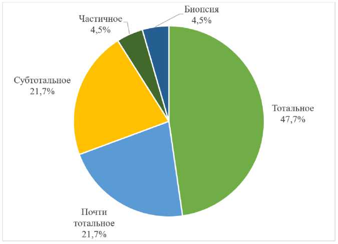 Радикальность удаления оценивалась в отношении той части опухоли, которая непосредственно являлась целью хирургической резекции. Тотальное удаление опухоли в нашем исследовании достигнуто в 47,8 % случаев (11 пациентов), почти тотальное в 21,7 % (5 пациентов), субтотальное в 21,7 % (5 пациентов), частичное в 4,3 % (1 пациент), биопсия в 4,3 % (1 пациент) (рис. 2). Интраоперационных осложнений не зафиксировано.