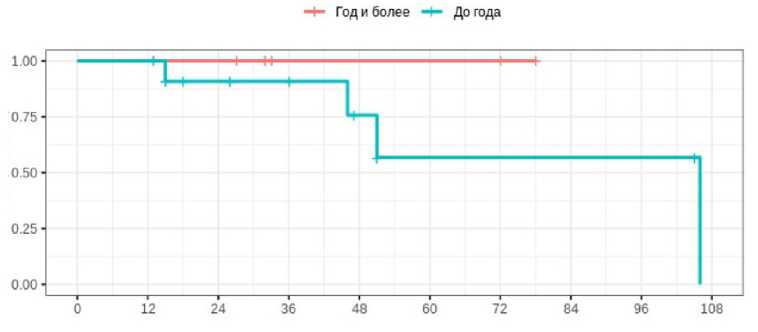 На рис. 3 представлен график беспрогрессивной выживаемости пациентов, разделенных на две группы: прошедшие лучевое лечение в пределах 12 мес. после операции и более чем через год после удаления.