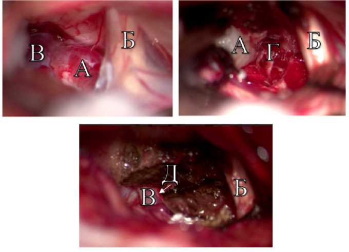 Fig. 5. Intraoperative images of tumor removal in the PCF of patient O. A — trigeminal neuroma; Б — facial acoustic nerve group; B — superior petrosal vein; Г — abducens nerve; Д — trigeminal nerve fibres