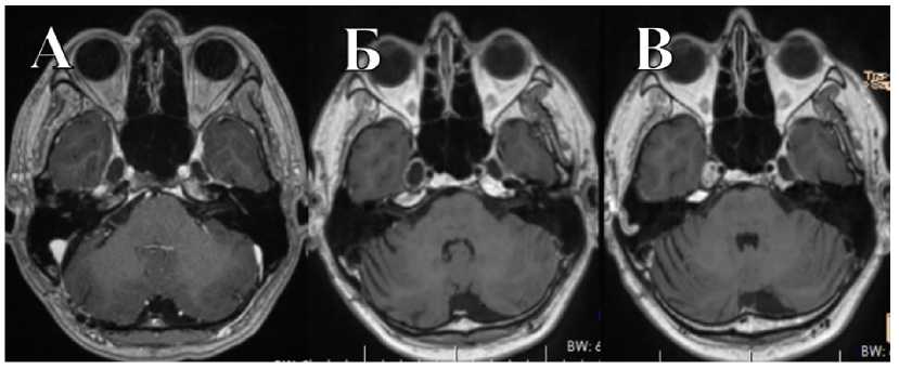 Рис. 6. МРТ пациента О.: А — перед лучевой терапией: невринома в СЧЯ, опухоль в ЗЧЯ удалена тотально; Б — через 6 мес. после лучевой терапии: небольшой остаток опухоли в СЧЯ; В — через 1 г. после лучевой терапии: небольшой остаток опухоли в СЧЯ