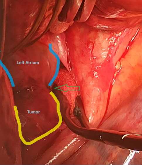 На втором этапе операции выполнен мультипортальный доступ справа. Начата мобилизация опухоли. Однако развилась десатурация до 75 %, которая потребовала перехода на двухлегочную вентиляцию и увеличения фракции кислорода во вдыхаемой смеси до 80 %. Заподозрена травма мембранозной части трахеи. Интраоперационно выполнена диагностическая фибробронхоскопия, травма исключена. Ввиду непереносимости однолегочной вентиляции продолжена двухлегочная ИВЛ, выполнена торакотомия справа. Произведено клипирование дренирующих опухоль вен в паратрахеальной области. При дальнейшей ревизии выявлена связь опухоли с задней стенкой левого предсердия (рис. 3). Для выполнения радикальной операции требовалась резекция левого предсердия в условиях искусственного кровообращения (ИК), что невозможно в условиях РНПЦ ОМР, в связи с чем операция была завершена. При манипуляциях с опухолью отмечались неоднократные подъемы артериального давления до 180/110 мм рт. ст и ЧСС до 120/мин, которые купировались в течение 5–10 мин. после прекращения манипуляций с опухолью.