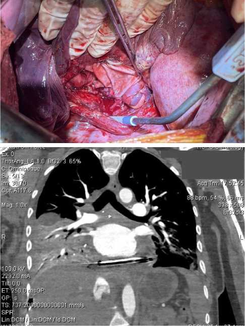 Рис. 4. Вид после завершения реконструкции предсердия бычьим перикардом: А — интраоперационное фото; Б — КТА-ОГК после операции