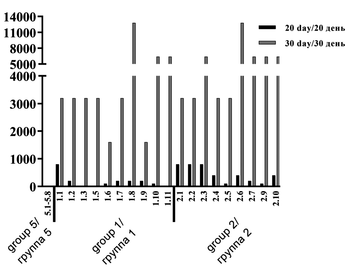 5. Рис. 4. Результаты определения титра вируснейтрализующих антител к ротавирусу А в сыворотке крови поросят, вакцинированных трехкратно.