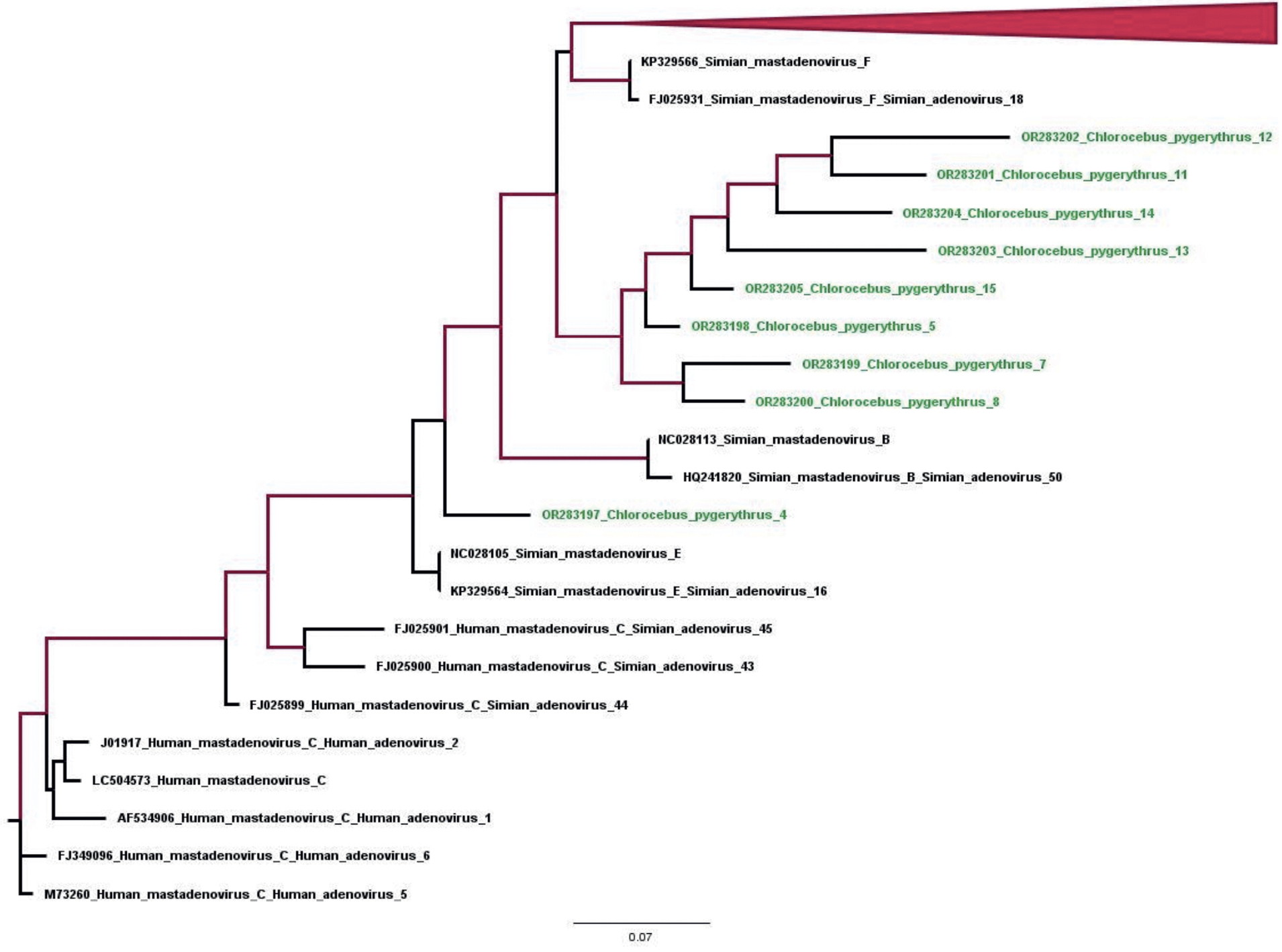 Введение. Приматы, наряду с грызунами и летучими мышами, наиболее часто оказываются резервуаром и источником зоонозных вирусных инфекций. Кроме того, у диких обезьян и у приматов, содержащихся в неволе, выявляют различные человеческие вирусы. Изучение вирусного разнообразия у обезьян необходимо для ограничения потенциальной передачи вирусов между людьми и приматами разных видов.