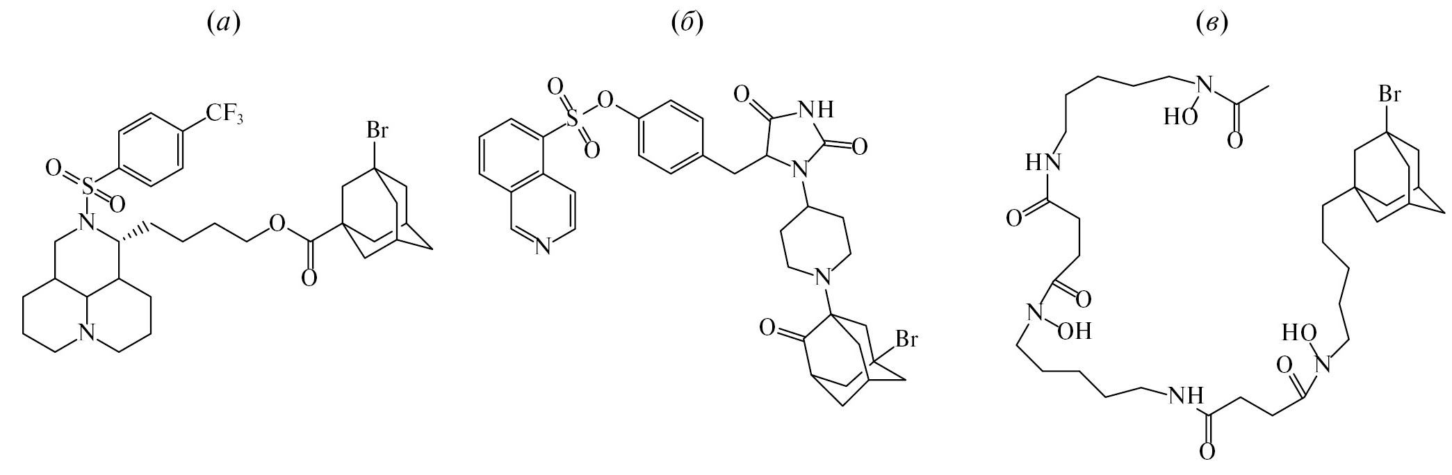1,3-Дизамещенные мочевины, содержащие адамантильный радикал, проявляют широкий спектр биологической активности. Соединения, содержащие в узловых положениях адамантана атомы галогенов, могут иметь не только повышенную метаболическую и термическую устойчивость, но и проявлять активность разных видов. Так, например, 3-бромадамантильный фрагмент стал привилегированной структурой для получения ингибиторов М2 протонных каналов [2] как потенциальных противовирусных средств, обладающих выраженной активностью в отношении вирусов гриппа типа H3N2 и H1N1 (рис. 1, a). Соединение (рис. 1, б), содержащее 3-бромадамантильный фрагмент, проявило высокую антагонистическую активность в отношении рецептора P2X7R [3] и может являться потенциальным средством не только для лечения воспалительных процессов, но и для профилактики нейродегенеративных заболеваний.
