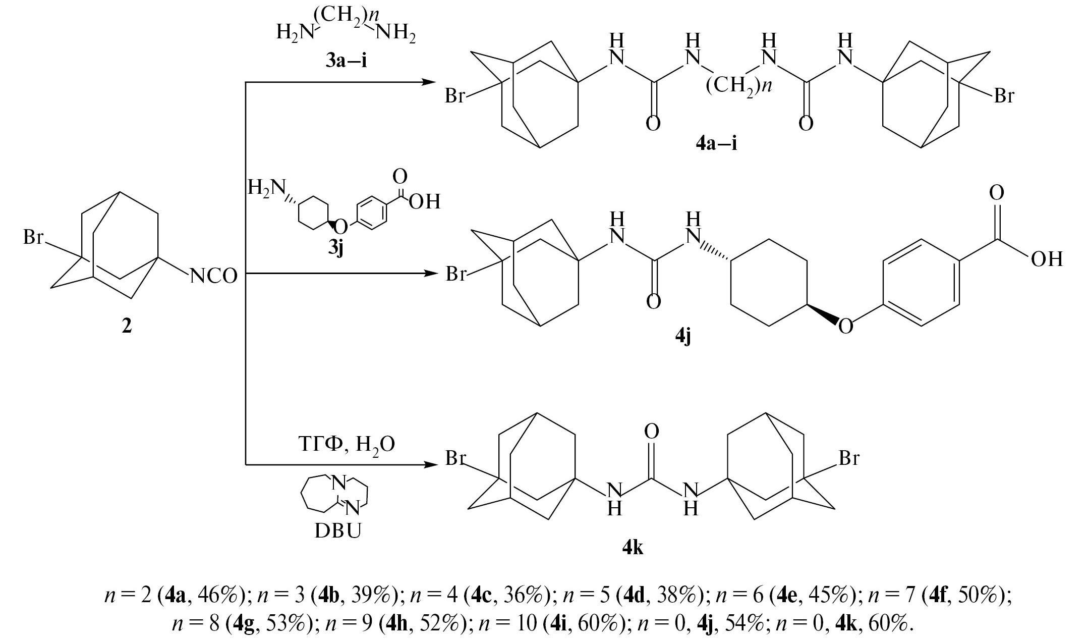 Для синтеза 1,3-дизамещенных димочевин 4a–i из изоцианата (2) были выбраны алифатические диамины 3a–i, а также транс-4-амино(циклогексилокси)бензойная кислота 3j, структура которой обеспечивает повышенную ингибирующую активность мочевин в отношении hsEH [11, 12]. Также по разработанной нами ранее методике была получена симметричная 1,3-дизамещенная мочевина 4k гидролизом (3-бромадамантан-1-ил)изоцианата (2) в присутствии 1,8-диазабицикло[5.4.0]-ундец-7-ена (DBU) (схема 2) [13].