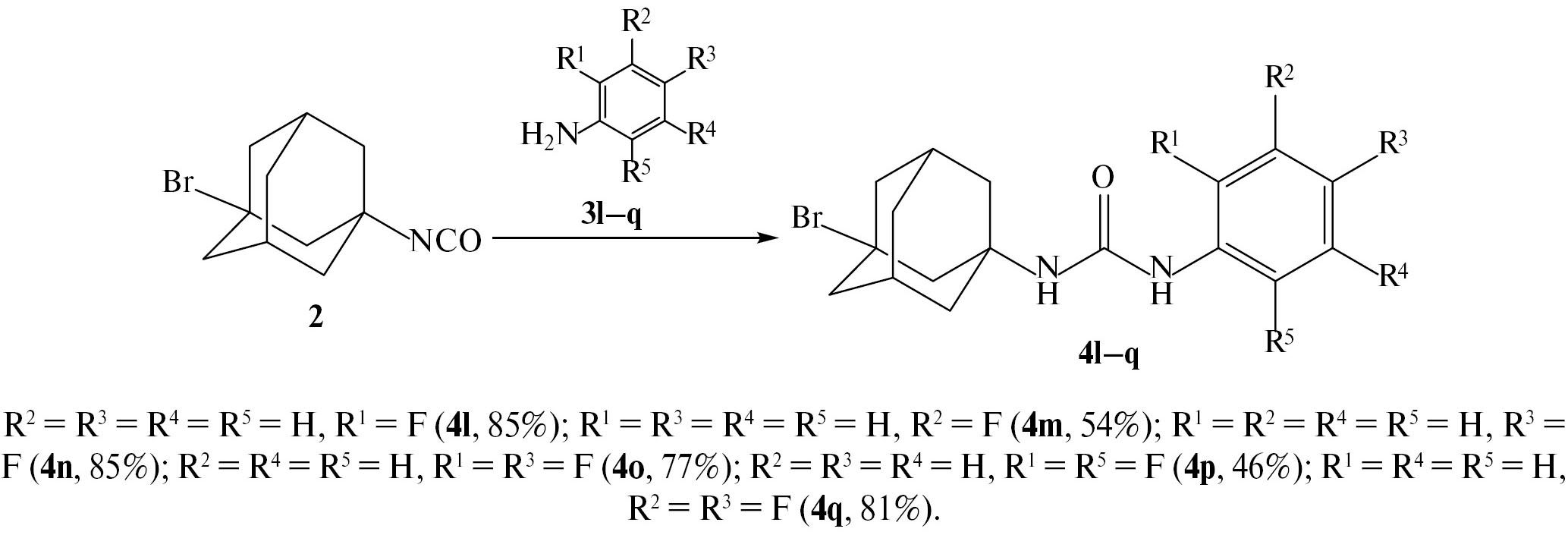На основе (3-бромадамантан-1-ил)изоцианата (2) были впервые получены мочевины, содержащие в качестве липофильной группы 3-бромадамантильный фрагмент, а в качестве вторичного фармакофора — фторфенилзамещенные фрагменты. Для этого изоцианат 2 был вовлечен в реакцию с фторсодержащими анилинами 3l–q (схема 3) с образованием 1,3-дизамещенных мочевин 4l–q.