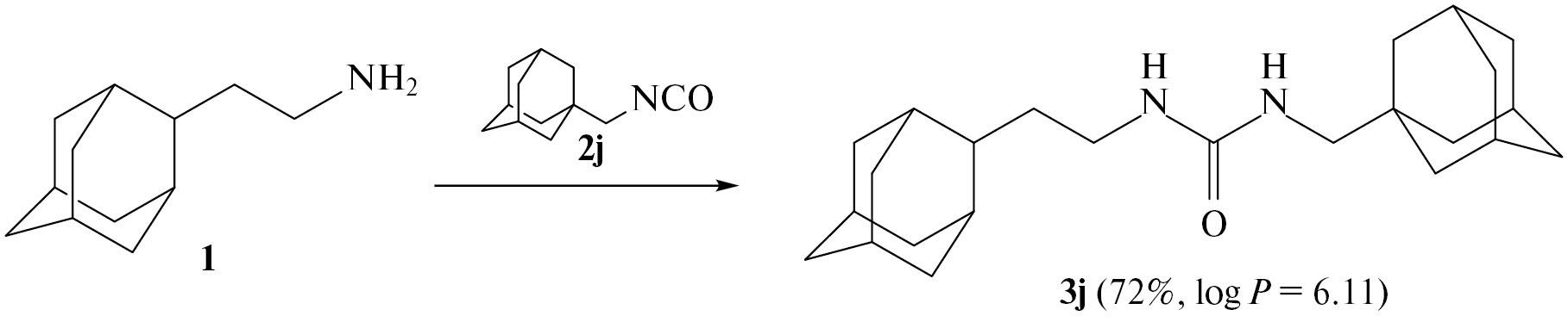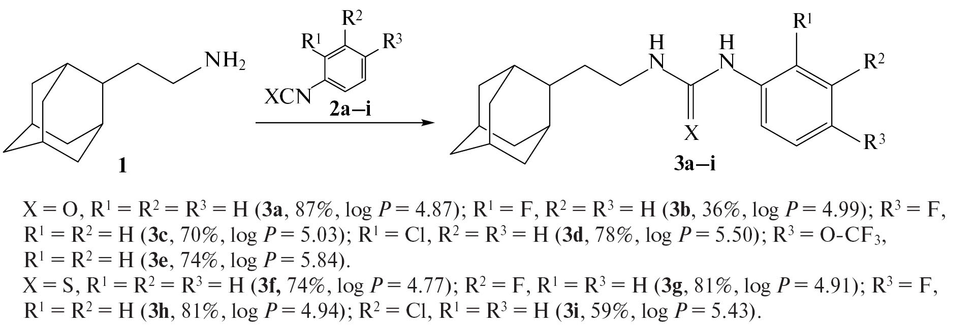 1,3-Дизамещенные мочевины 3a–e получали взаимодействием 2-(адамантан-2-ил)этиламина (1) с ароматическими изоцианатами 2a–e (схема 1), а тиомочевины 3f–i — в аналогичной реакции с изотиоцианатами 2f–i. Кроме того, из (адамантан-1-ил)метилизоцианата (2j) была получена диадамантилсодержащая несимметричная мочевина 3j (схема 2). Выбор изоцианатов для синтеза обусловлен высокой ингибирующей активностью полученных ранее мочевин, содержащих галогензамещенные ароматические фрагменты [6].