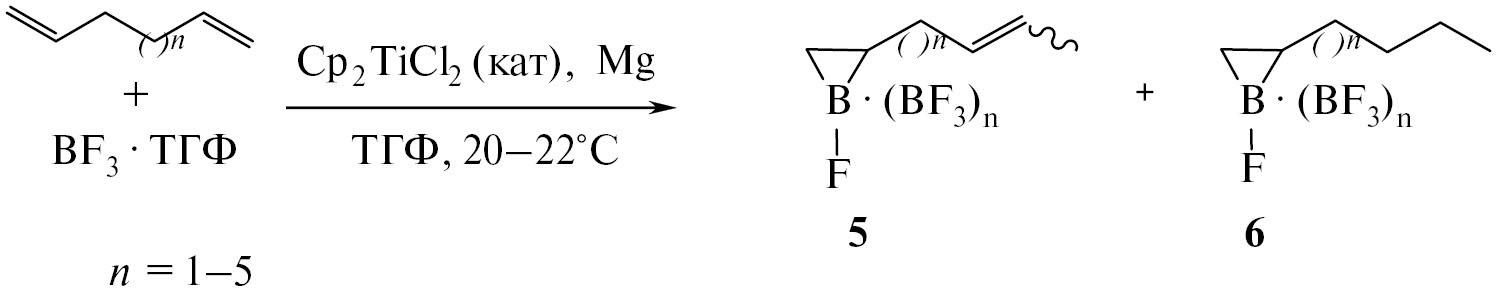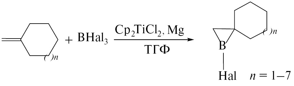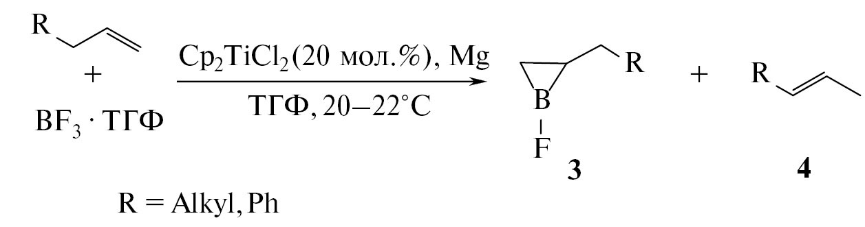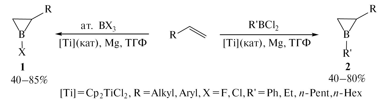 Недавно мы показали, что комплекс титана Cp2TiCl2 в присутствии акцептора галоген-ионов Mg позволяет реакцией циклоборирования α-олефинов с помощью галогенидов бора и алкил(арил)галогенборанов получать редкие и труднодоступные соединения − борациклопропаны − 1-хлор(фтор)- и 1-алкил(арил)-2-замещенные борираны 1, 2 (схема 1) [23−28].