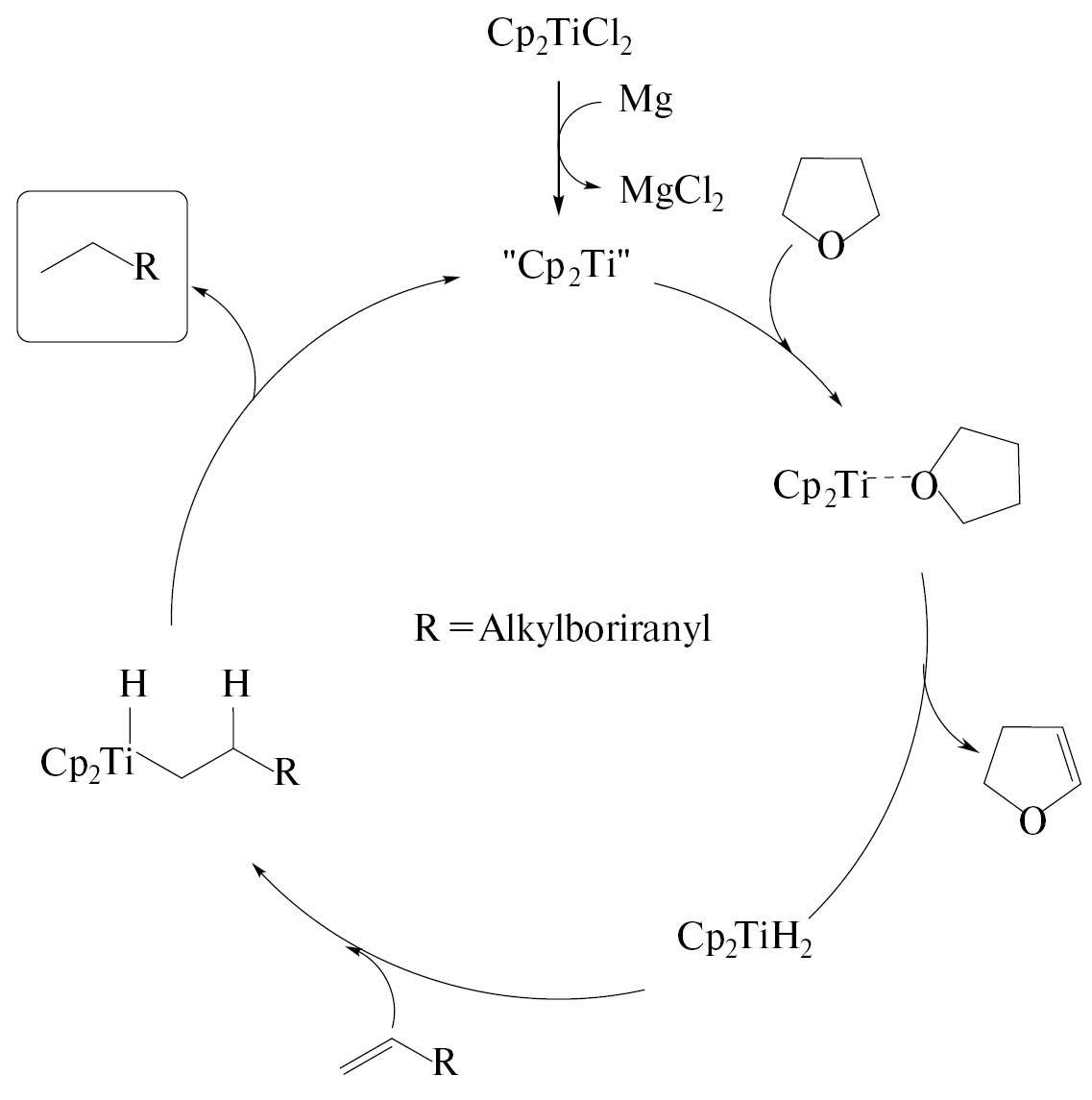 Схема 2. Взаимодействие α-олефинов с BF3·ТГФ под действием Cp2TiCl2.