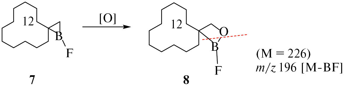 В масс-спектре обнаружен пик фрагментарного иона с m/z 196 (рис. 2). Вероятно, нестабильный 1-фторзамещенный бораспиран 7 окисляется в кювете с растворителем (ТГФ) с образованием продукта окисления 8 (схема 6), для которого и зафиксирован пик с m/z 196, характеризующий отрыв группы BF от молекулы. В литературе известны примеры, когда от борорганической молекулы отщепляется борсодержащий фрагмент вместе с заместителем, например, В(ОН)2 или OВ(ОН) [33]. При этом какие-либо данные по идентификации органических соединений бора с фрагментом B−F методом масс-спектрометрии в литературе нами не найдены.