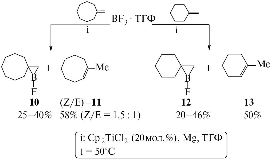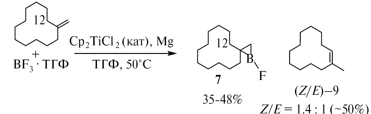 Реакция метиленциклоалканов с BF3·ТГФ в присутствии катализатора Cp2TiCl2. В стеклянный реактор (20 мл) в атмосфере аргона при перемешивании последовательно загружали при 0°С 10 мл ТГФ, 0.04 г (1.6 ммоль) Mg (порошок), 0.72 г (4 ммоль) метиленциклододекана (или 0.50 г метиленциклооктана, или 0.38 г метиленциклогексана), 0.2 г (0.8 ммоль) Cp2TiCl2, 2.24 г (16 ммоль) BF3·ТГФ. Смесь перемешивали при 50°С в течение 6−8 ч. Избыток магния отфильтровывали, растворитель выпаривали и продукты реакции анализировали методами ЯМР 1Н, 13С, 11В, 19F. Соединения (Z/E)-9, (Z/E)-11, 13 очищали методом колоночной хроматографии на силикагеле (элюент — петролейный эфир), взвешивали для определения выходов. При интегрировании протонного спектра ЯМР 1Н получали информацию о выходе соединений 7, 10, 12.