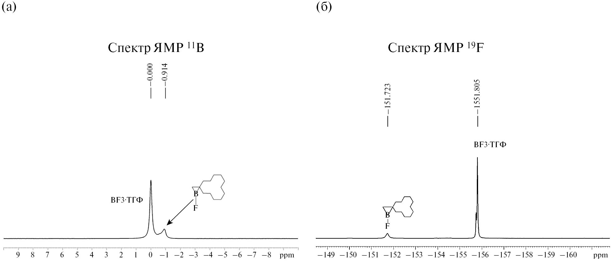 В соответствии с вышеизложенным сначала изучена реакция метиленциклододекана с BF3·ТГФ в присутствии Cp2TiCl2 и Mg в разработанных условиях [мономер – BF3·ТГФ−Cp2TiCl2−Mg в соотношении 1 : 4 : 1 : 0.2 : 1, ТГФ, 50°С, 6 ч]. В спектре ЯМР 11В реакционной смеси зафиксировано 2 сигнала атома бора: сигнал при δВ 0.00 м.д. соответствует исходному BF3·ТГФ, взятому в избытке, а сигнал при δВ −0.91 м.д. отнесен к продукту реакции − целевому 1-фтор-замещенному спироборирану (рис. 1 а). Сильнопольный сигнал атома бора (δВ −0.91 м.д.) свидетельствует о наличии тетракоординированного атома бора, что связано с комплексообразованием спироборирана с молекулой растворителя (ТГФ). Эти выводы были сделаны на основе ранее полученных спектральных данных для 1-фтор-2-алкилбориранов, для которых сигнал δВ проявляется в области от −1.10 до −1.78 м.д. [24]. Сигнал атома фтора 1-фторзамещенного спироборирана проявляется при δF −151.72 м.д. (рис. 1 б)