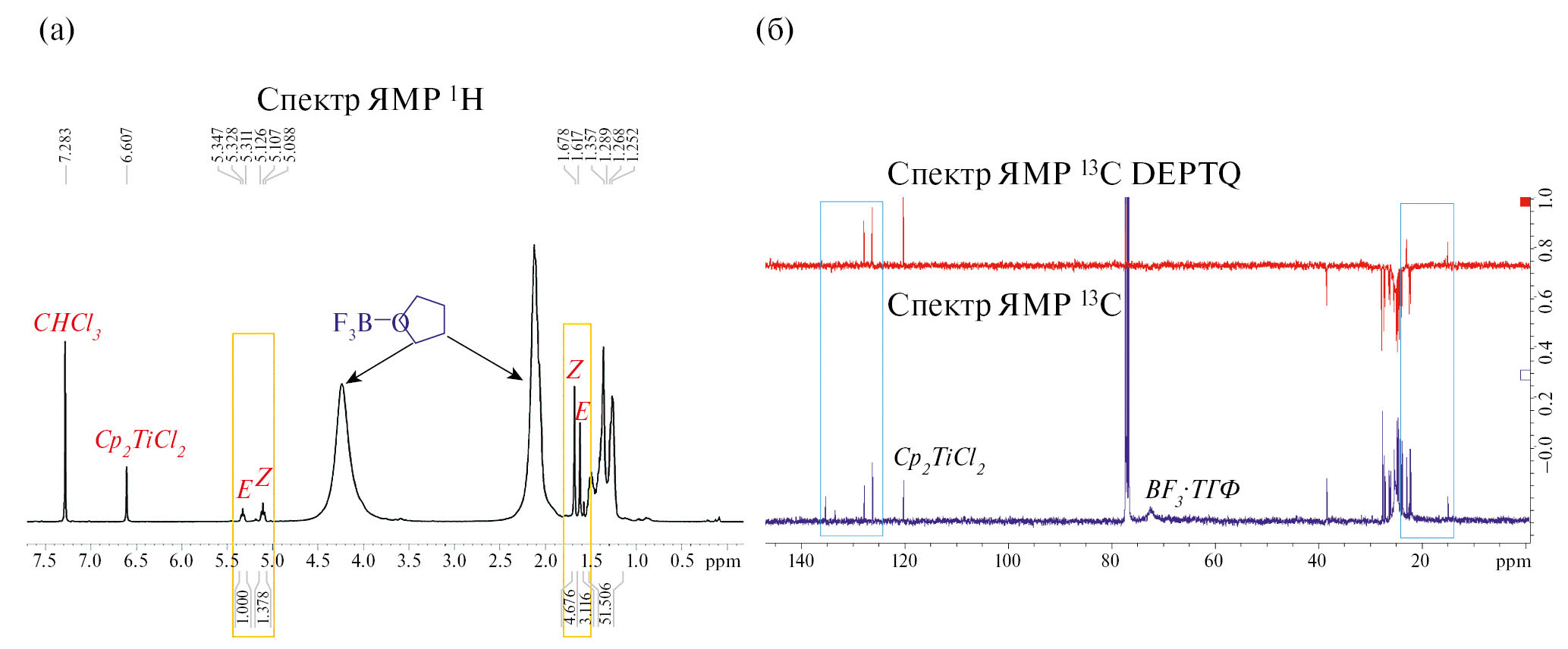 Рис. 3. Cпектры ЯМР 1Н (а) и 13С (б) (вместе с 13C DEPTQ) реакционной смеси после взаимодействия метиленциклододекана с BF3·ТГФ в присутствии Cp2TiCl2/Mg (CDCl3, 298 K)