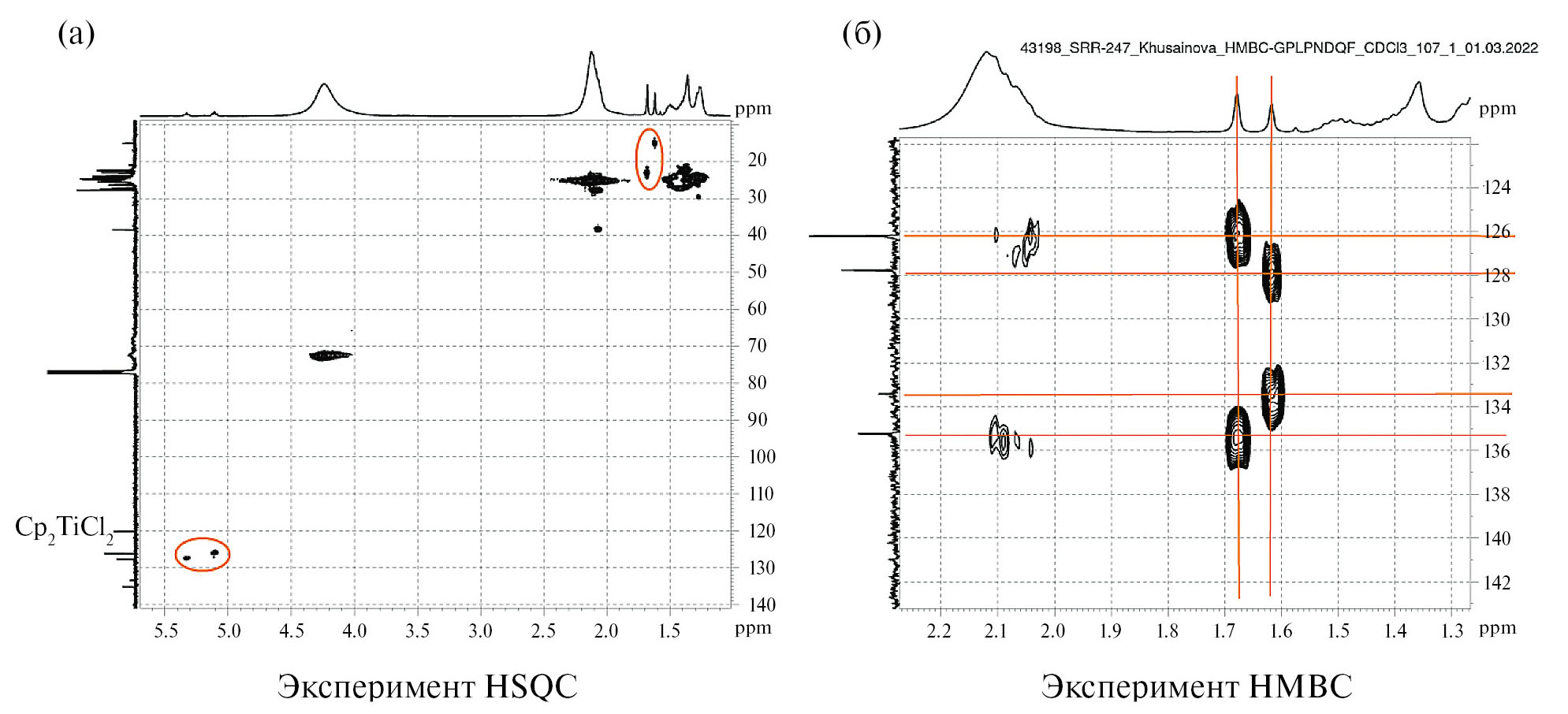Рис. 4. Эксперименты HSQC (а) и HMBC (фрагмент) (б) реакционной смеси после взаимодействия метиленциклододекана с BF3·ТГФ в присутствии Cp2TiCl2/Mg