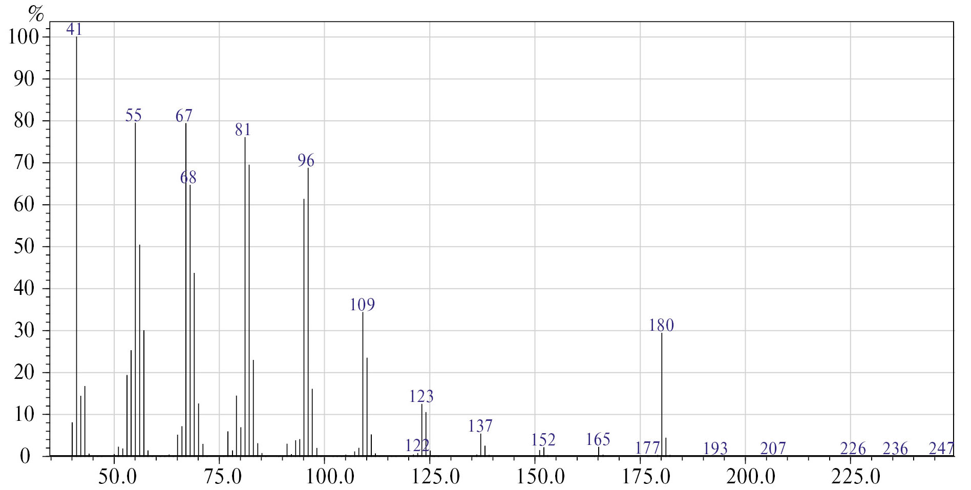 В масс-спектре обоих изомеров обнаружен пик молекулярного иона с m/z 180 (рис. 5), соответствующий 1-метилциклододец-1-ену.