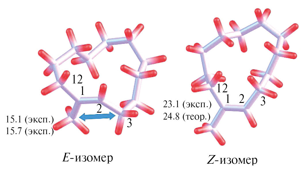 Рис. 6. Структура (Z/E)-изомеров 1-метилциклододец-1-ена, оптимизированная методом B3LYP/cc-pVDZ (химические сдвиги ЯМР 13С приведены в м.д.)