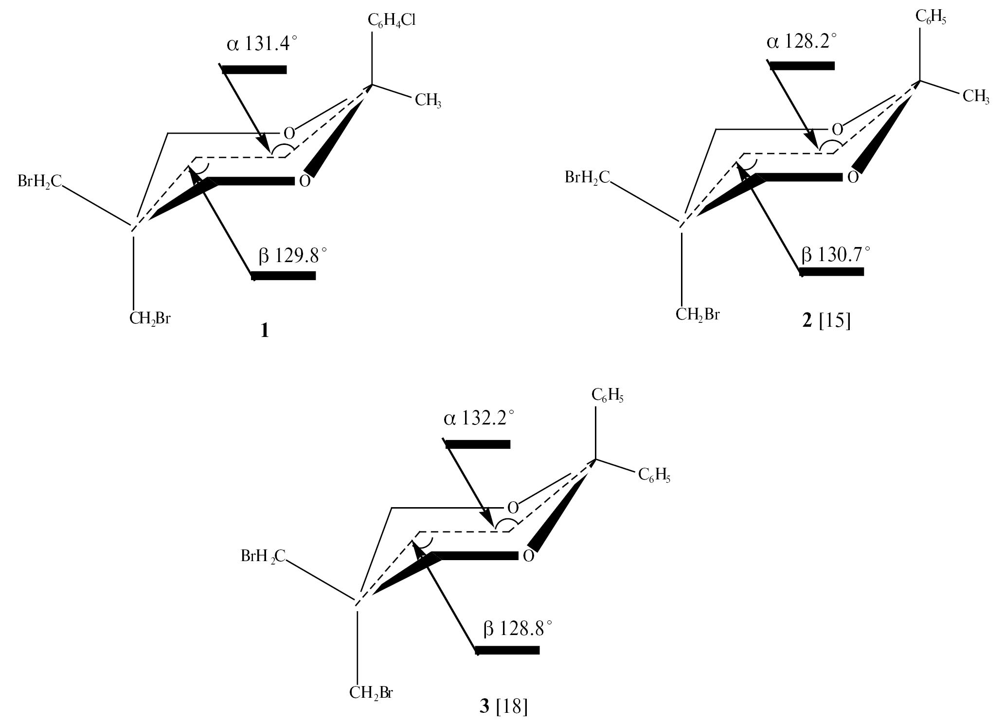 Сравнение значений межплоскостных углов α и β, установленных по результатам рентгеноструктурных измерений [15, 18] и в настоящей работе, свидетельствует о влиянии заместителей у атома С2 в кеталях 1‒3 на параметры складчатости 1,3-диоксанового кольца в кристаллической фазе (рис. 2). Так, появление атома хлора в фенильном заместителе в случае кеталя 1 приводит к возрастанию угла α на 2.2° и уменьшению угла β на 0.9° по сравнению с диоксаном 2. В случае 2 фенильных заместителей у атома С2 (кеталь 3) тенденция к уплощению гетероатомного фрагмента и увеличению складчатости углеродной части цикла сохраняется. При этом максимальная сумма углов α и β (261.1°) наблюдается для диоксана 1. Отмеченные изменения являются результатом совокупного действия стерических и электронных факторов.