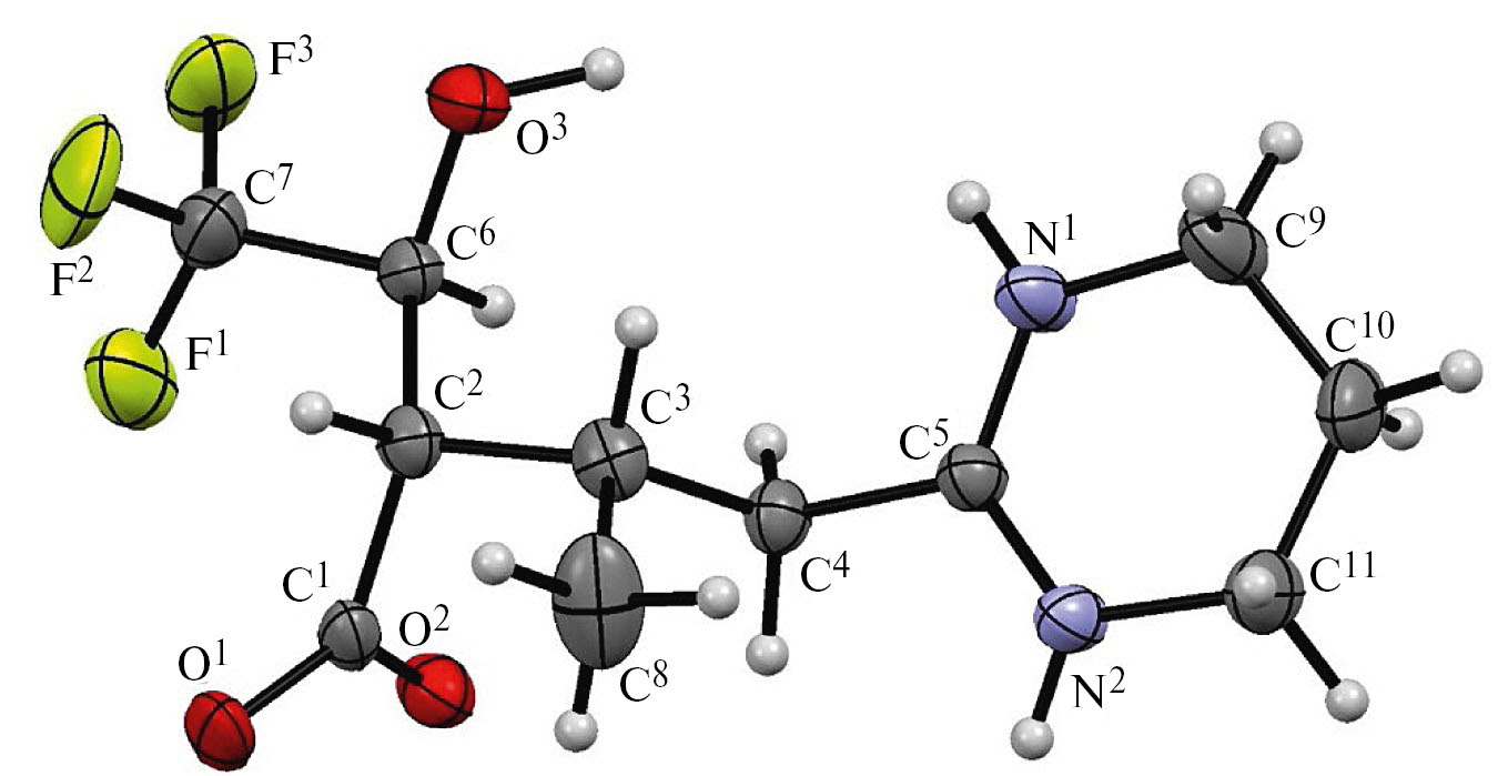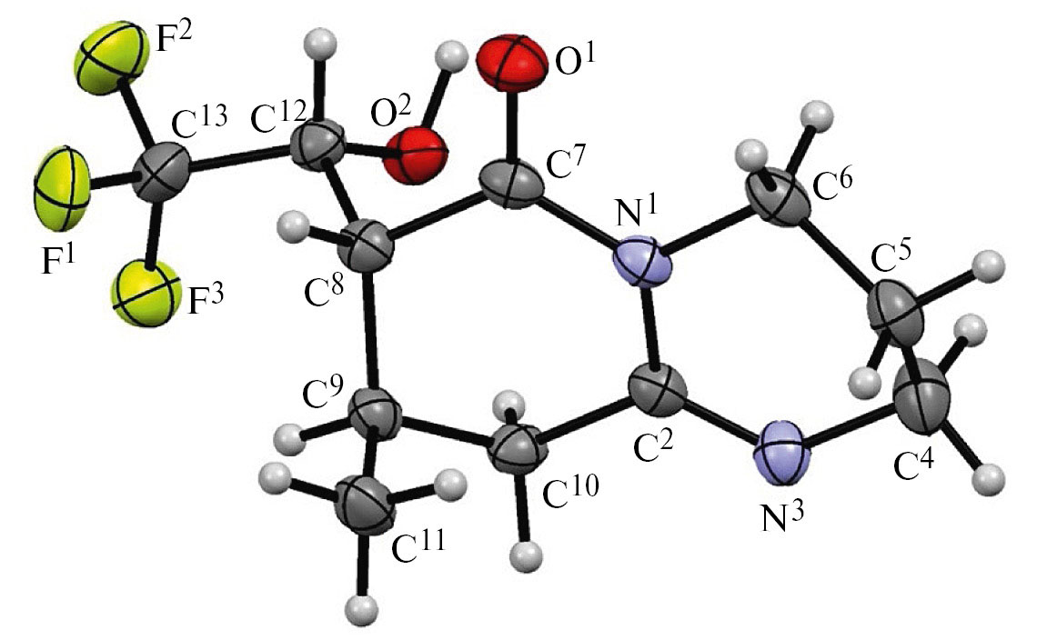Монокристаллы соединения 5 получали кристаллизацией из воды, C11H17F3N2O3, M = 282.26, монокристаллы моноклинные, пространственная группа P21/c, a = 9.0730(11) Å; b = 12.4735(11) Å; c = 12.1413(14) Å; a = 90°, β = 104.059(12)(8)°, g = 90°, V = 1332.9(3) Å3, Z = 4, dвыч = 1.407 г/см3, m(MoKa) = 0.129 см–1, F(000) = 592.0. Общее число отражений 10309, число независимых отражений 3602 (Rint = 0.0487), число отражений с I ≥ 2σ(I) 1754, R1 = 0.0589, wR2 = 0.1276 и GOOF = 1.024.