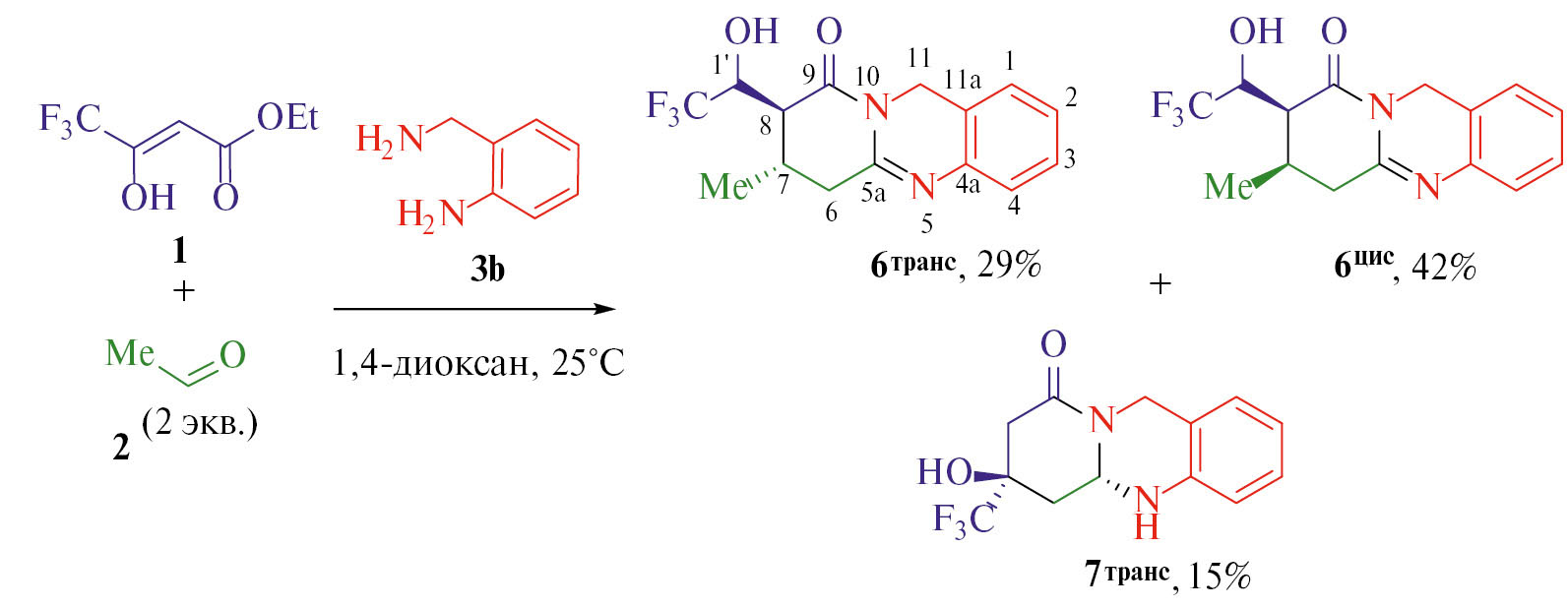 Далее в реакцию эфира 1 с двукратным избытком уксусного альдегида 2 ввели 2-аминометиланилин 3b в качестве динуклеофильного реагента (схема 2). Оказалось, что эта циклизация проходит менее селективно с формированием смеси продуктов, из которой удалось выделить 2 изомера тетрагидропиридо[2,1-b]хиназолин-9-она 6транс и 6цис, содержащих фторспиртовый заместитель, с небольшим преобладанием цис-изомера. Помимо этого, получен продукт трехкомпонентной циклизации по дикарбонильному фрагменту эфира 1 – гексагидро-9H-пиридо[2,1-b]хиназолин-9-он 7. Разделение продуктов реакции было также основано на их различной растворимости (см. экспериментальную часть).
