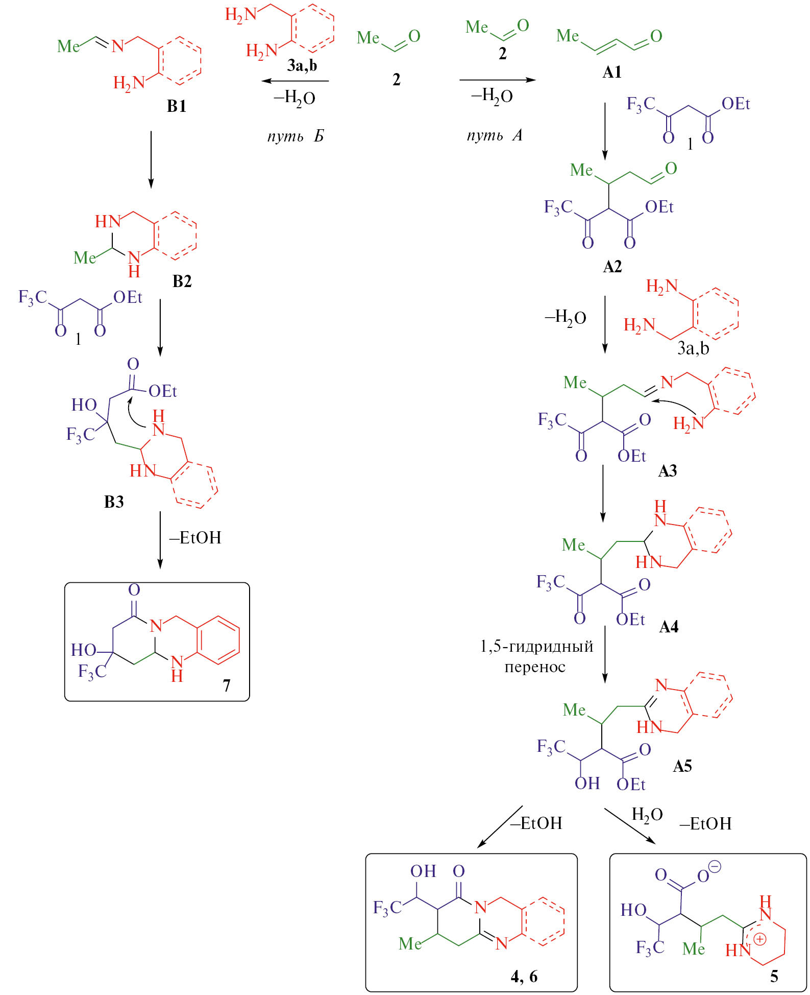В ходе трёхкомпонентной реакции реализуется конкурентный процесс формирования пиридохиназолинона 7 (схема 3, путь Б). В этом случае ацетальдегид 2 конденсируется с 2-аминометиланилином 3b, образуя последовательно енамин B1 и хинозалин B2, метильная группа которого присоединяется к трифторацетильному заместителю эфира 1, давая интермедиат В3. Последний циклизуется с участием этоксикарбонильного заместителя и аминогруппы гетерокольца в соединение 7. Аналогичный путь наблюдали при взаимодействии с этилендиамином [12], однако с 1,3-диаминопропаном 3a реакция в таком направлении не идет, что зафиксировано при анализе реакционной массы методом ГХ-МС.