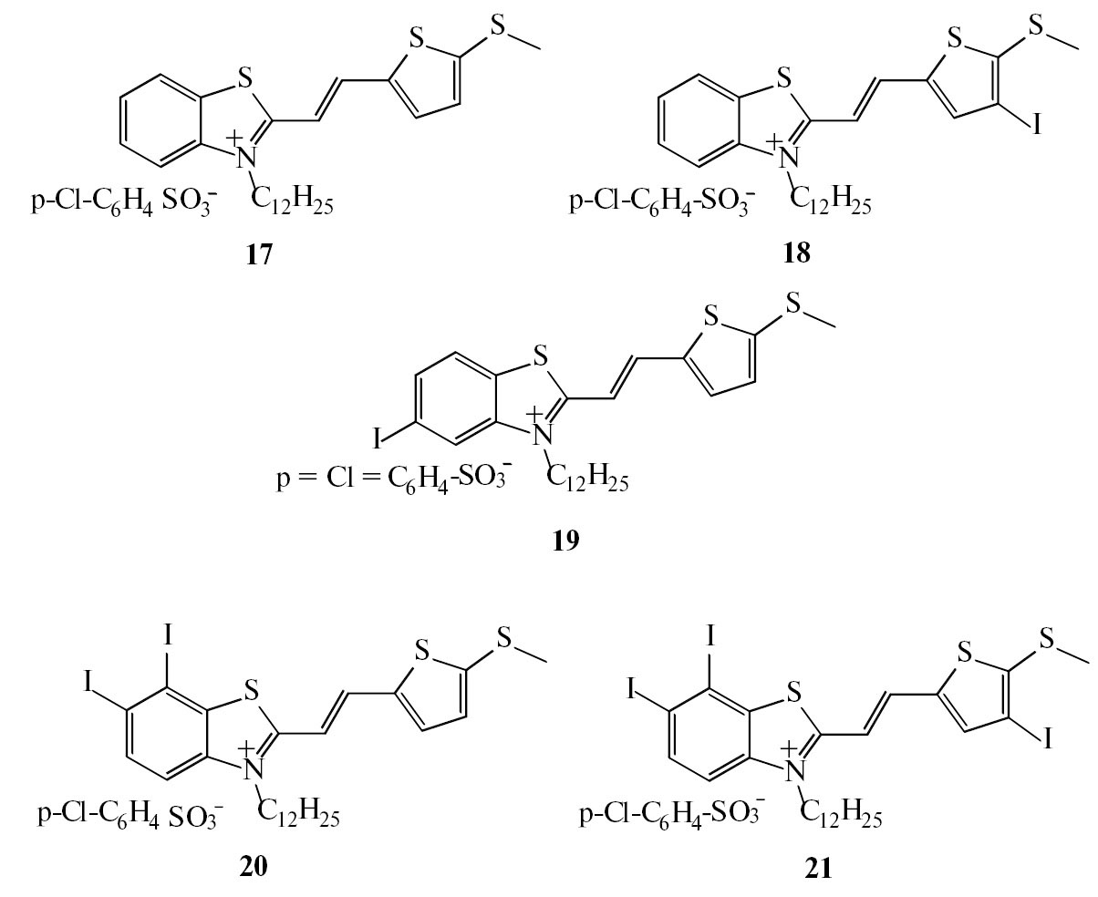 4-Хлорбензолсульфонат (E)-3-додецил-6,7-дийод-2-{2-[4-йод-5-(метилтио)тиофен-2-ил]винил}бензо[d]тиазол-3-ия (21) получали из 0.20 г (0.25 ммоль) соли бензотиазолия 8 и 0.07 г (0.26 ммоль) 4-йод-5-(метилтио)тиофен-2-карбоксальдегида (12) в 1 мл уксусного ангидрида в течение 5 ч при 110°С. Выход 0.24 г (79%), темно-красный порошок, т.пл. 130–135°С. ЭСП (CHCl3), lmax, нм (lg e): 430 (4.55). Спектр ЯМР 1H (400 МГц, CDCl3), δ, м.д.: 0.84 т (3H, СН3, J 6.9 Гц). 1.02–1.40 м (18H, 9СН2), 1.76–1.84 м (2H, СН2), 2.65 с (3H, SСН3), 4.91 т (2H, N–CH2, J 7.2 Гц), 7.22 м (2H, Наром), 7.51–7.60 м (2H, СН=, Наром), 7.78–7.71 м (3H, Нтиофен, 2Наром), 8.03 д (1H, Наром, J 8.8 Гц), 8.11 д (1H, CН=, J 15.1 Гц). Найдено: [М]+ 835.80. [C26H33I3NS3]+. Вычислено: M + 835.89.