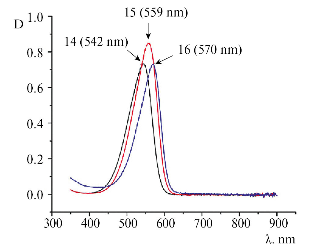 Рис. 2. ЭСП диметиламинобензилиденсодержащих красителей 14–16 в хлороформе (основной переход)