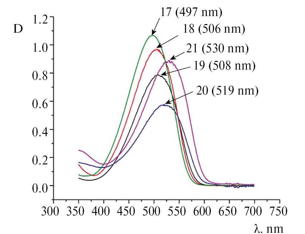 Рис. 3. ЭСП 5-(метилтио)тиофениленсодержащих красителей 17–21 в хлороформе (основной переход)