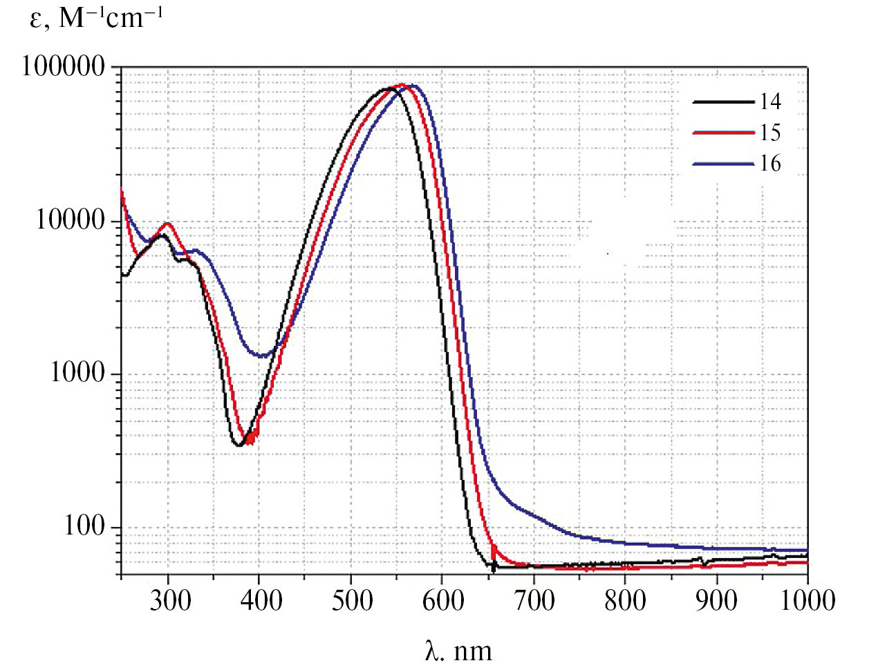 Рис. 4. Спектральные кривые молярной экстинкции 4-(диметиламино)бензилиденсодержащих красителей 14–16 в ацетонитриле, представленные в логарифмической шкале ординат
