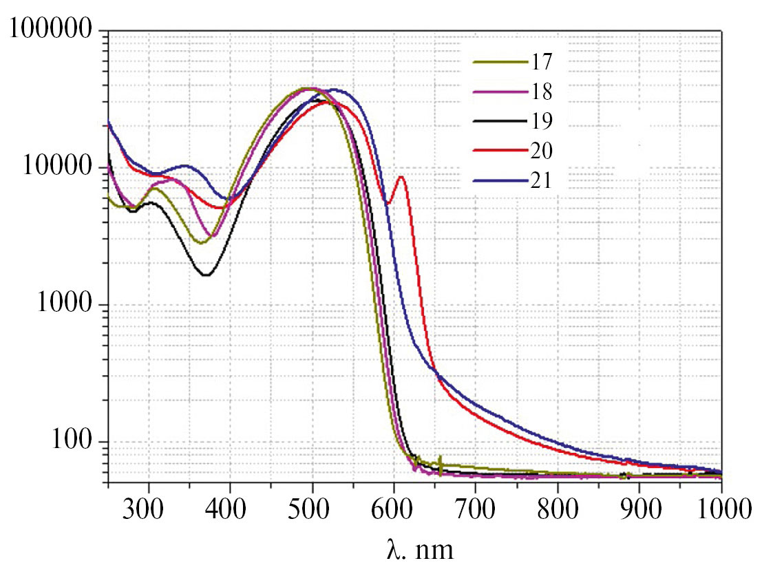 Рис. 5. Спектральные кривые молярной экстинкции 5-(метилтио)тиофениленсодержащих красителей 17–21 в ацетонитриле, представленные в логарифмической шкале ординат